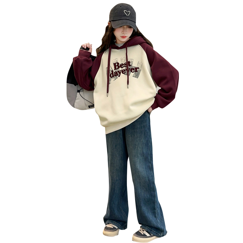 女大童加绒卫衣套装秋冬季2025新款连帽上衣加厚休闲牛仔裤两件套