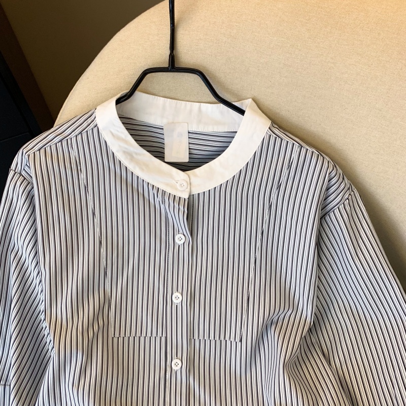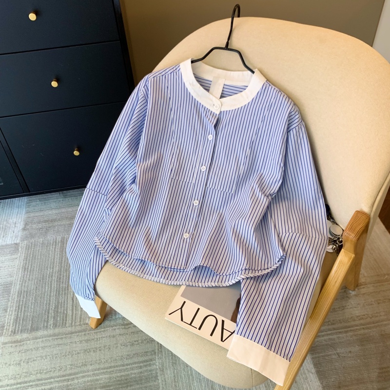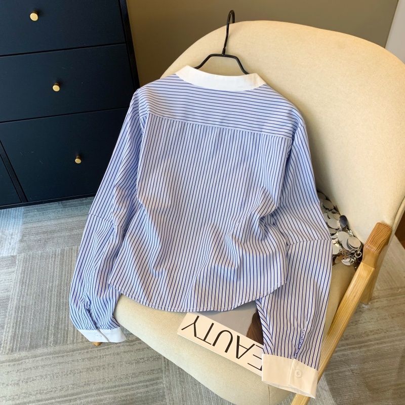 上~韩版气质蓝色条纹长袖衬衫女秋学院风宽松短款灯笼袖衬衣