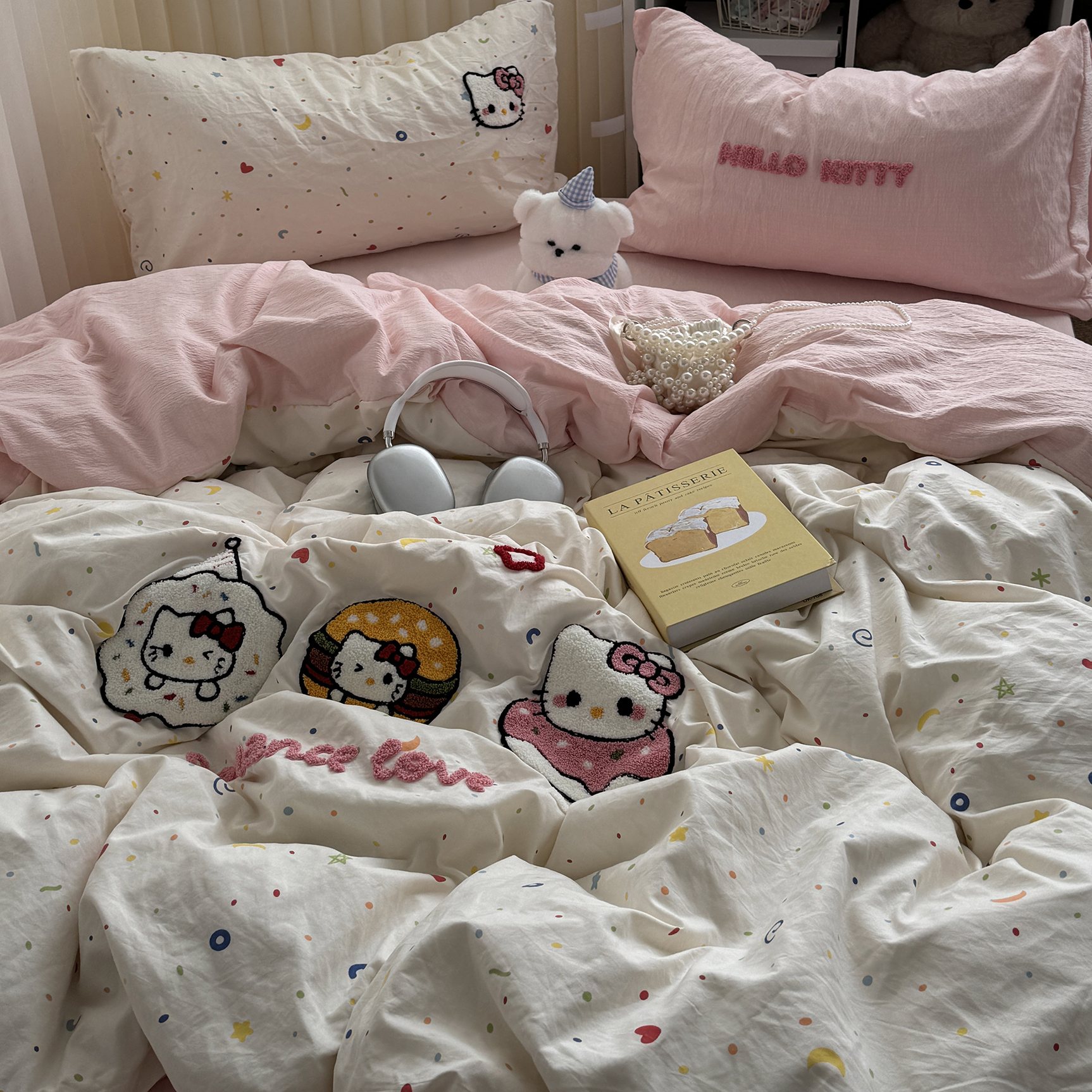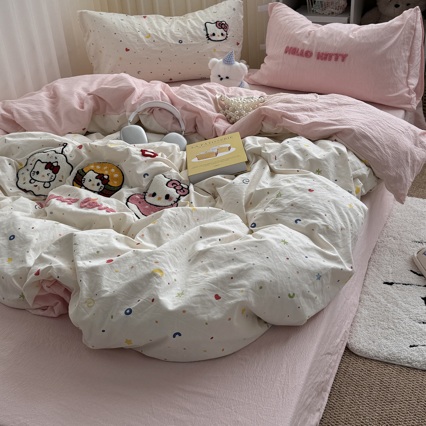 卡通ins可爱猫咪毛巾绣被套水洗棉四件套全棉床单学生宿舍三件套