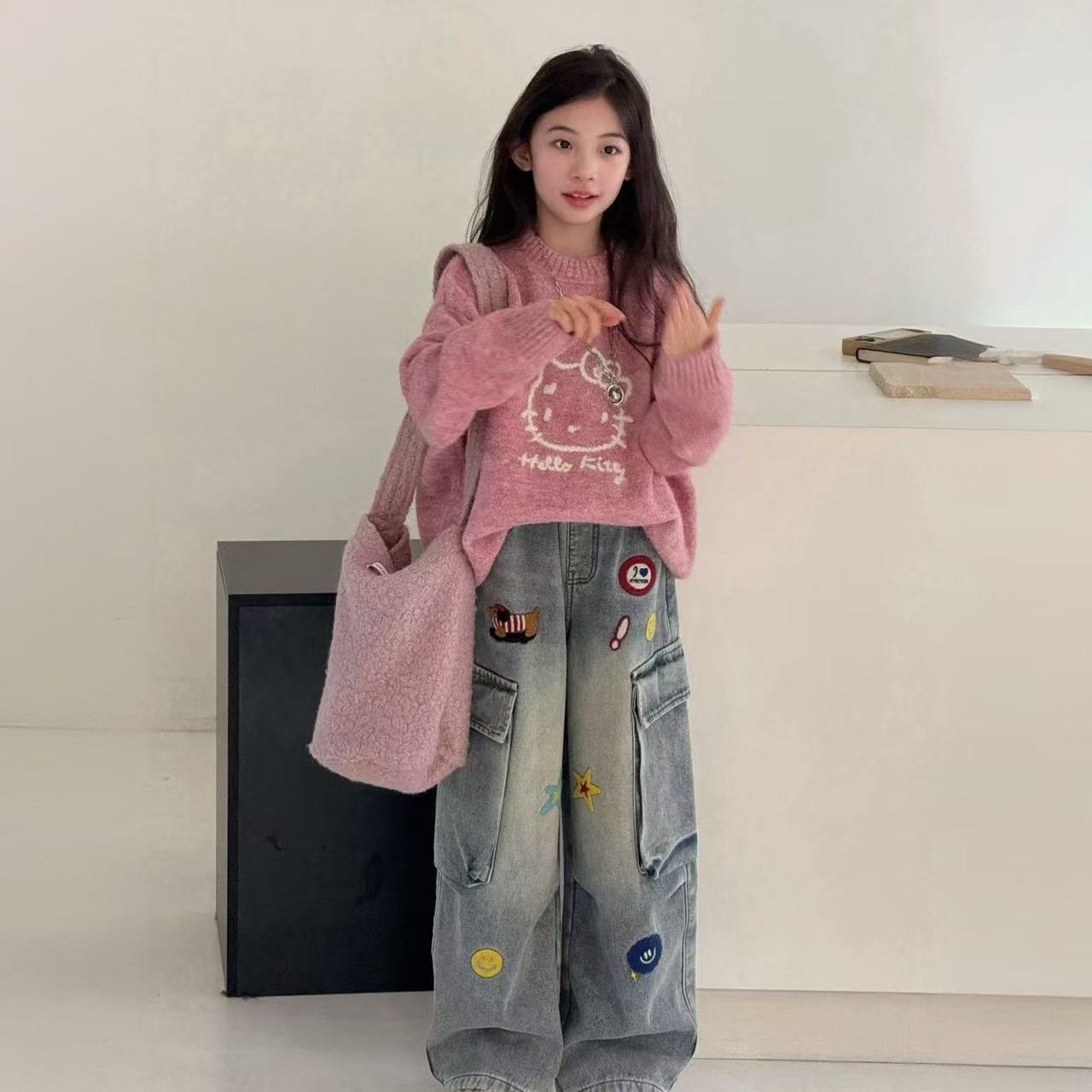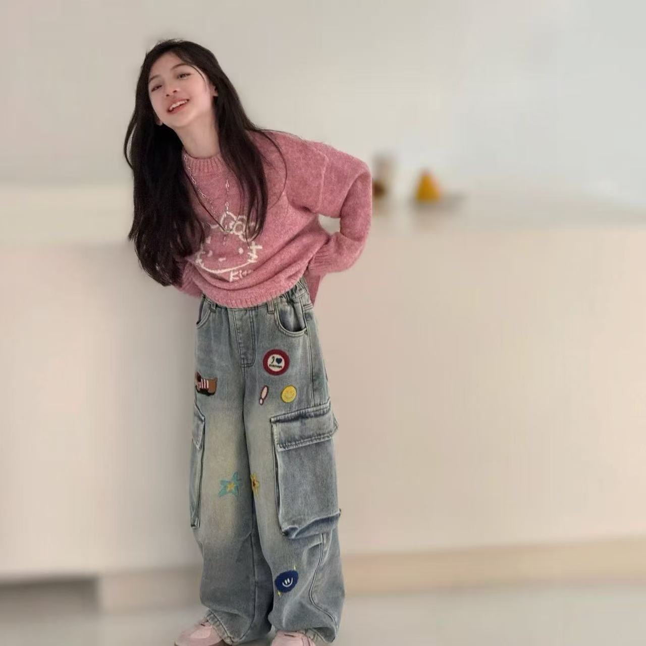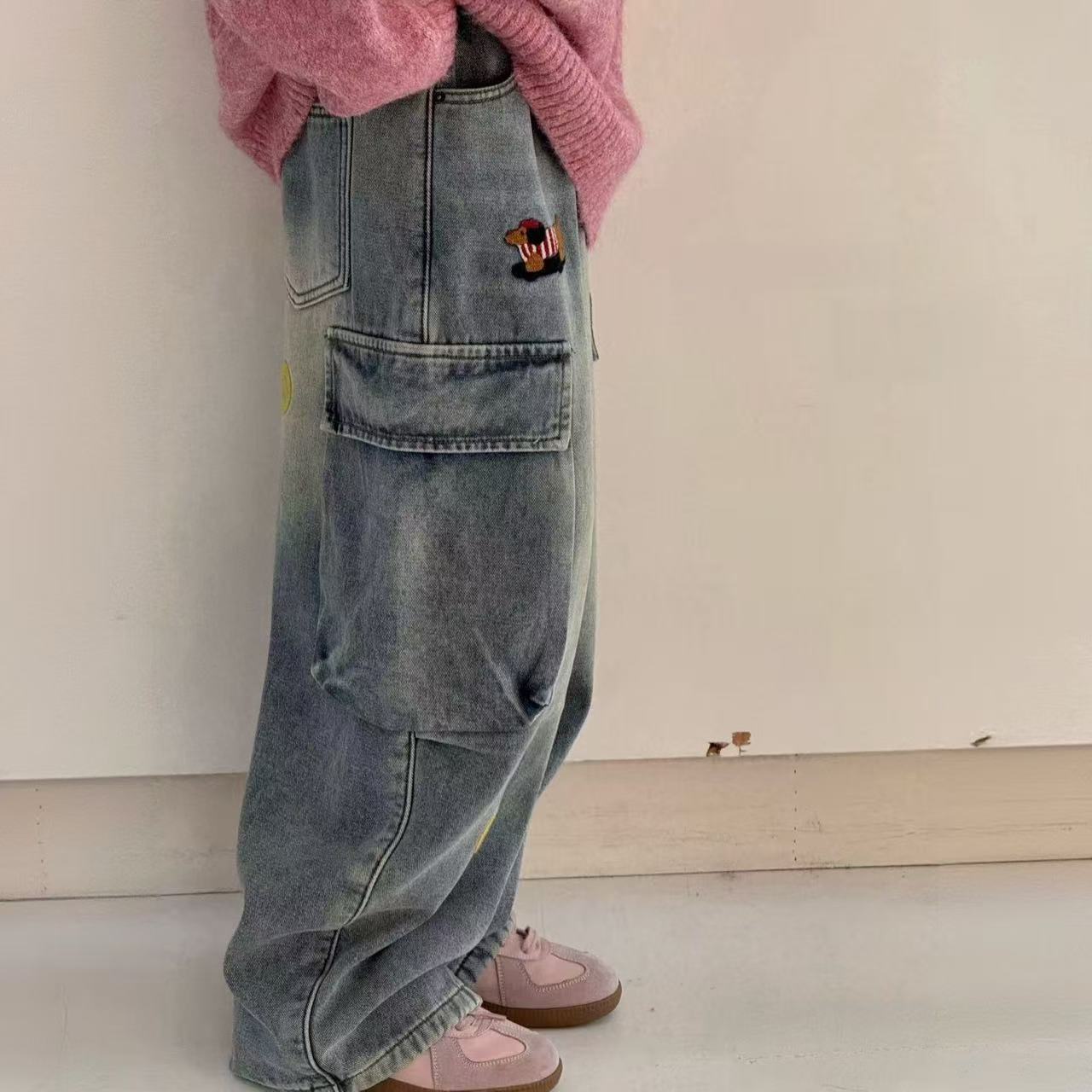 熙爱女童2025秋冬新款韩版休闲加绒重工刺绣工装口袋牛仔长裤