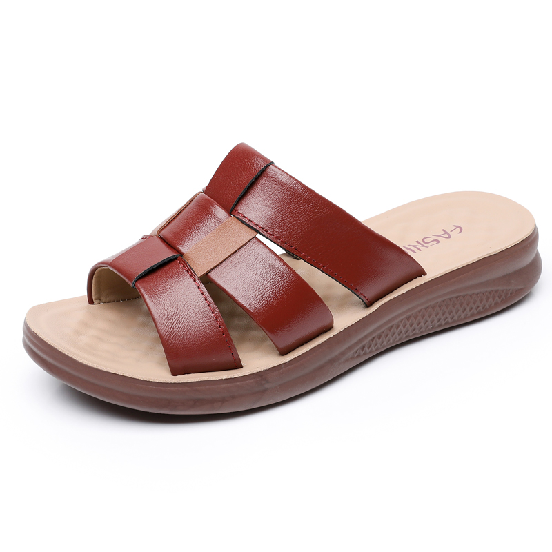 新款妈妈拖鞋女夏外穿软底防滑真皮中老年凉拖头层牛皮一字拖平跟