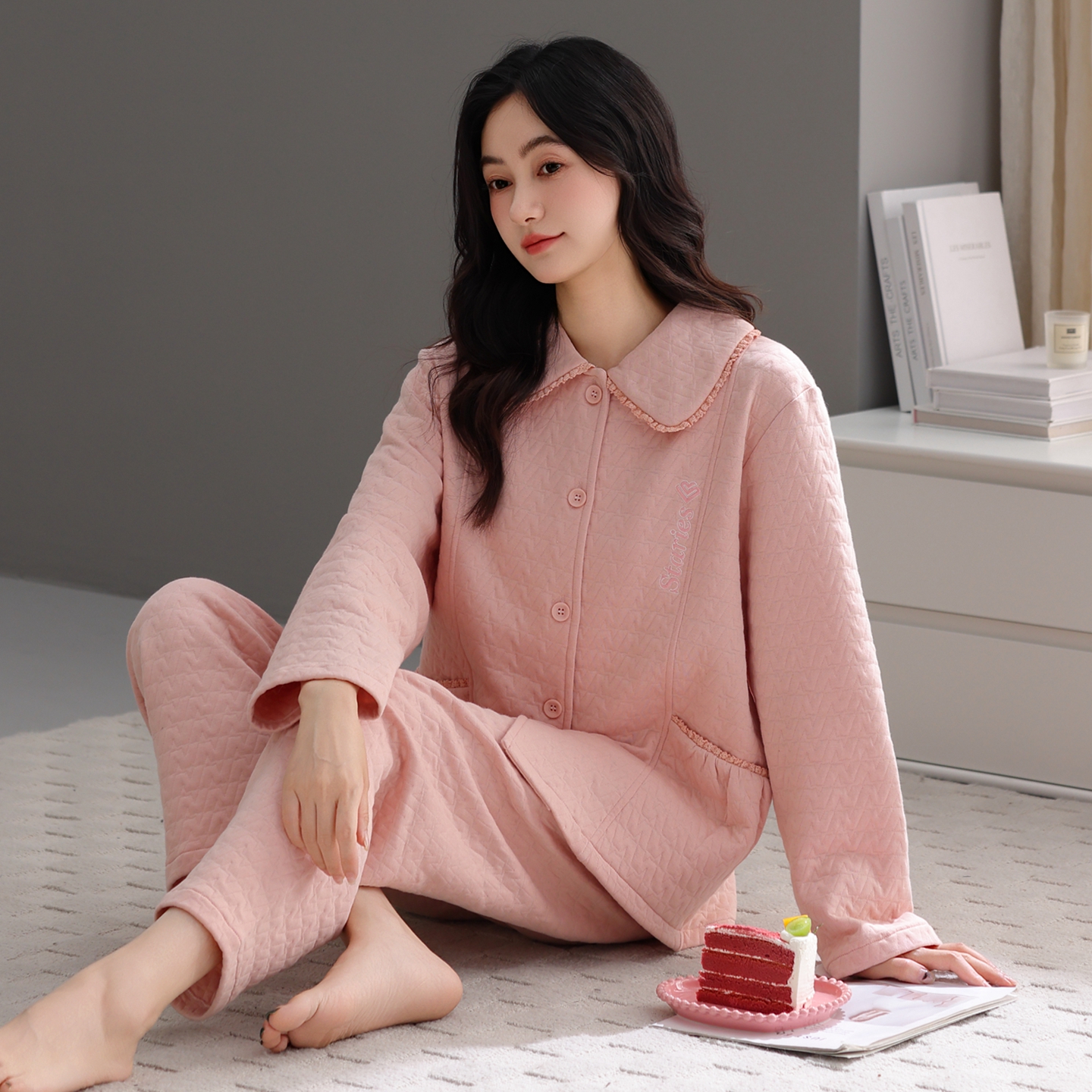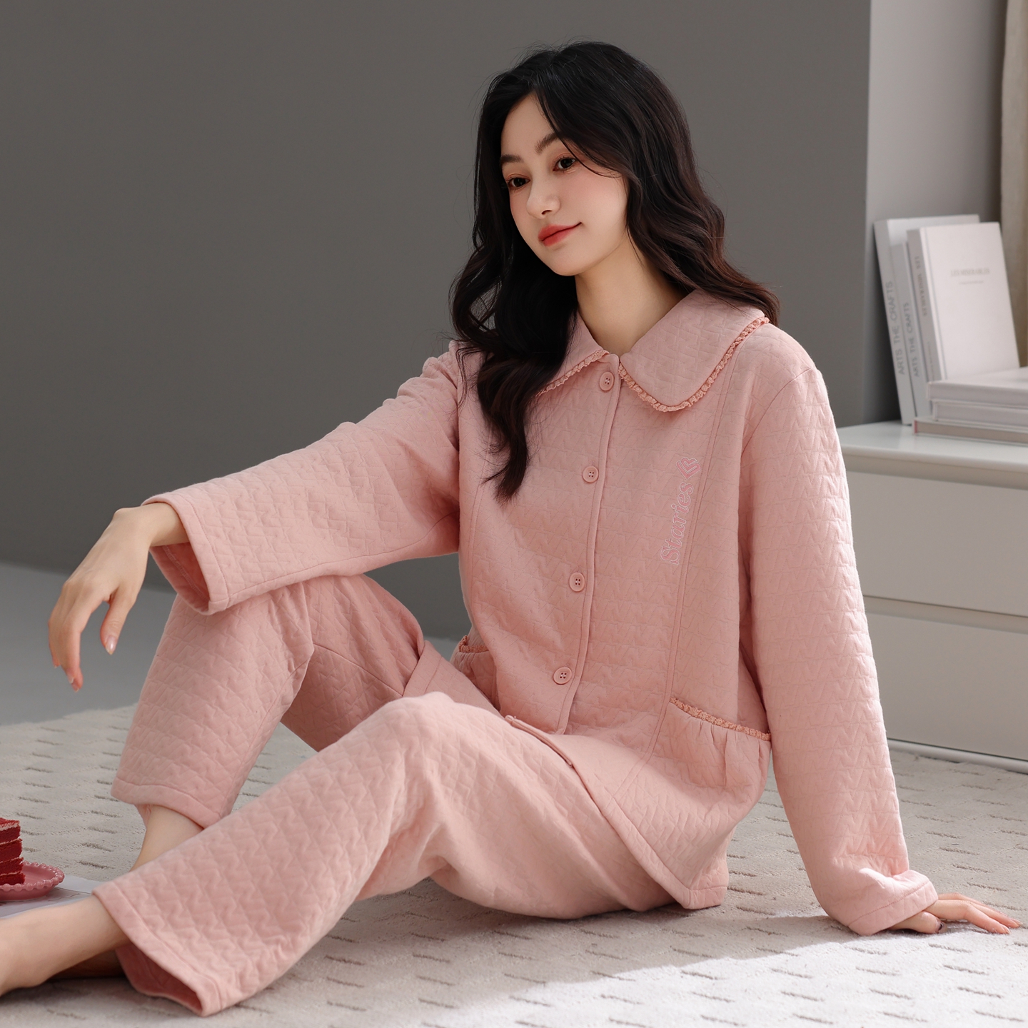 纯棉夹层棉睡衣女秋冬天舒适保暖开衫长袖空气棉加厚薄夹棉家居服