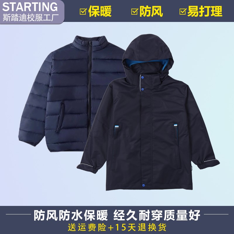 冬季羽绒服校服中小学生男女童枣红墨绿藏青外套冲锋衣棉服两件套