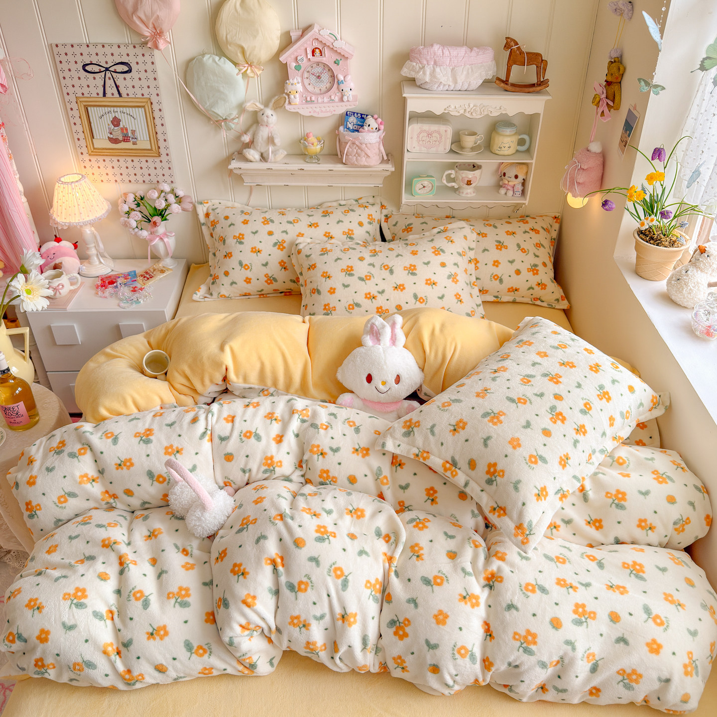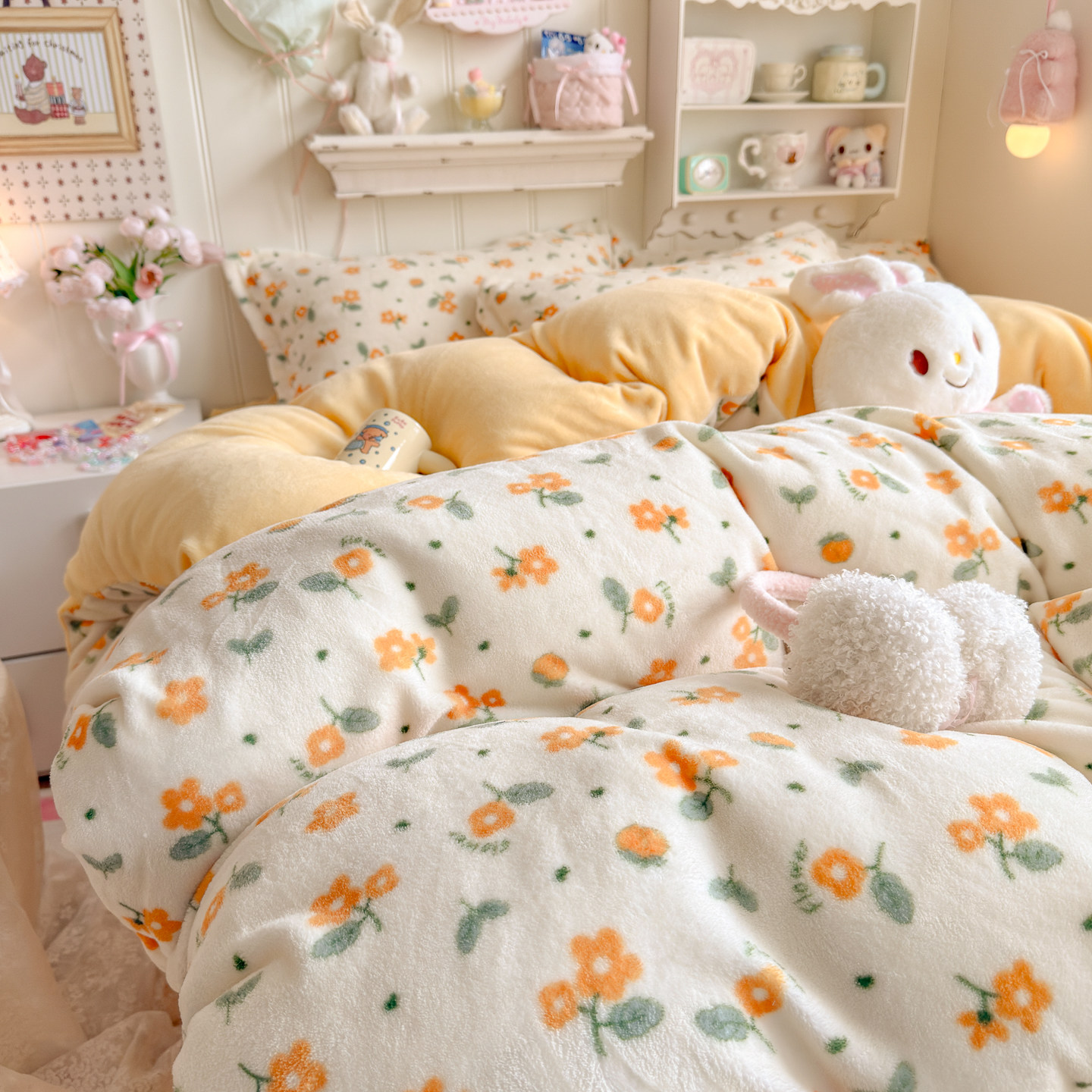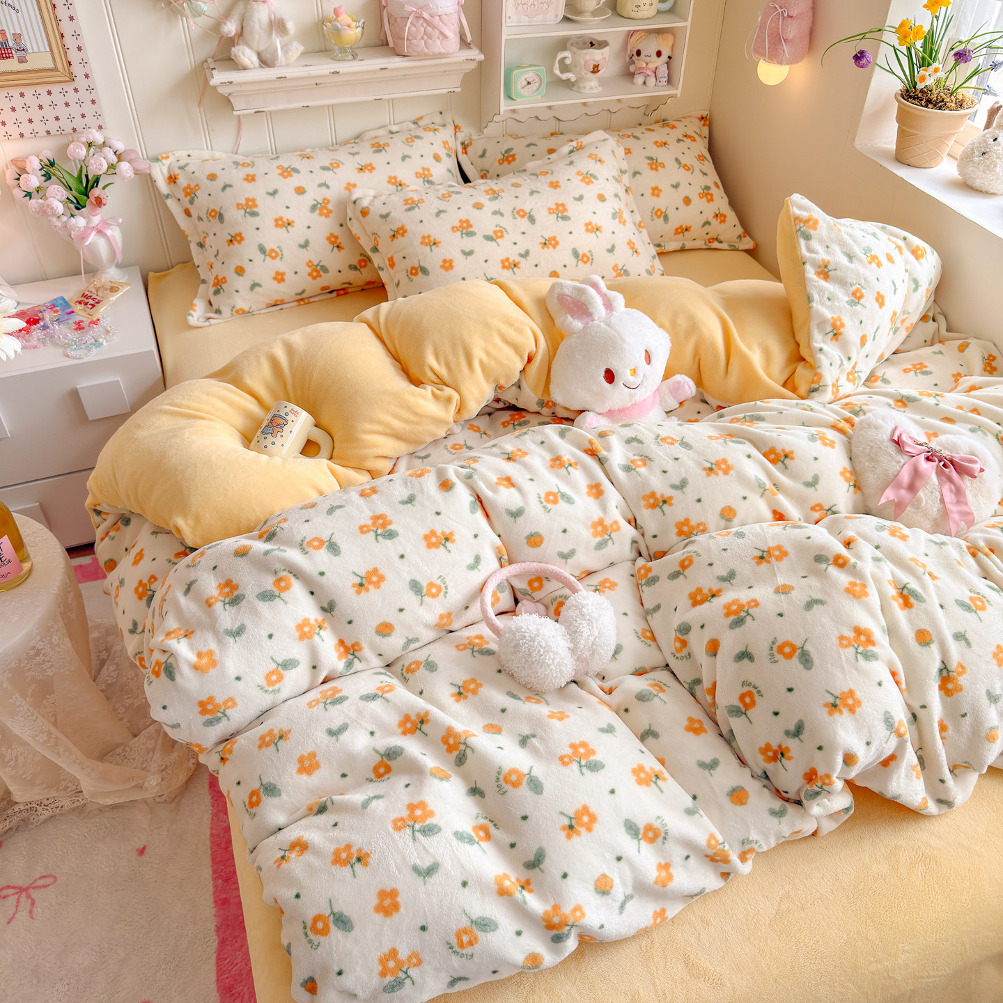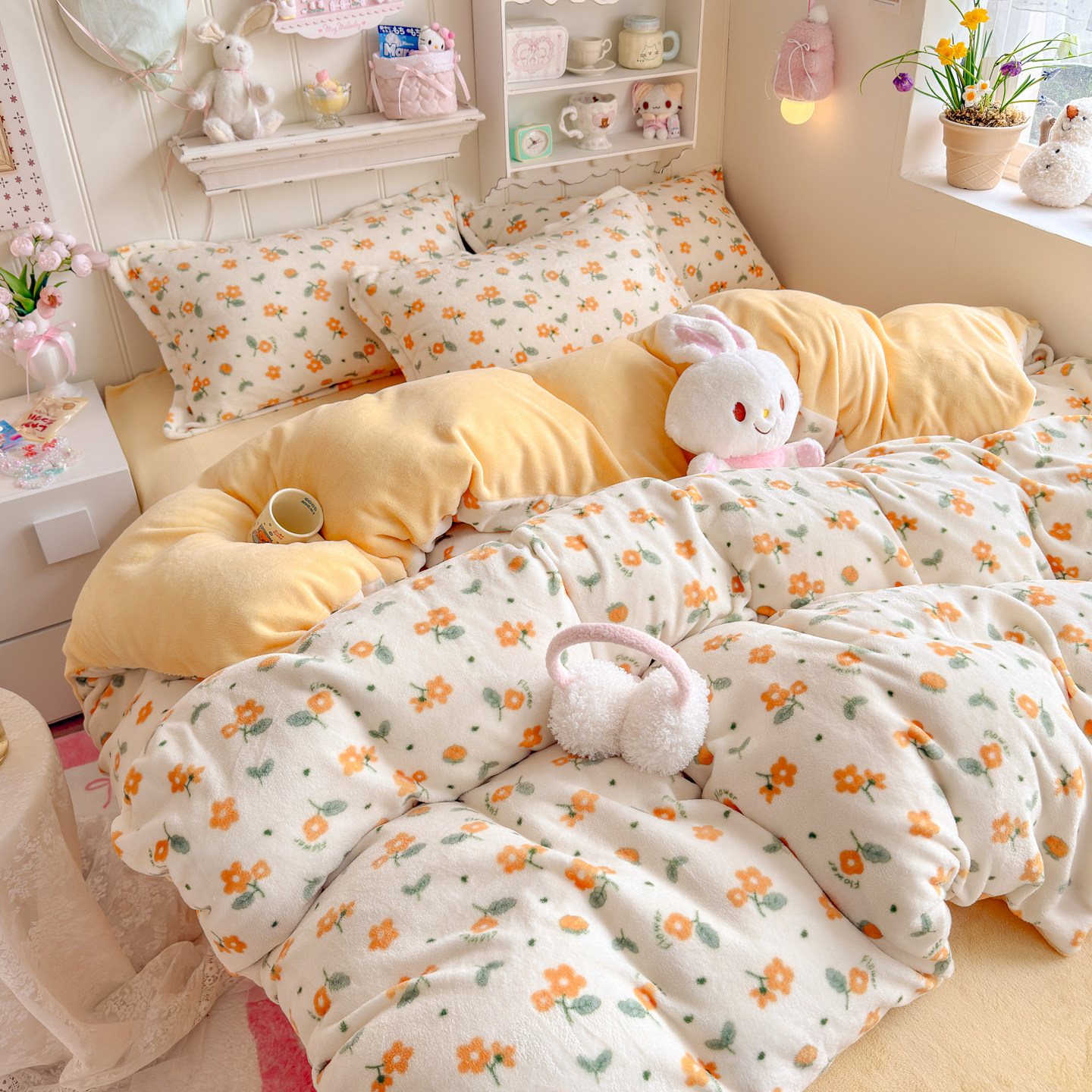 冬季ins黄色碎花牛奶绒四件套双面珊瑚绒被套宿舍加绒床单三件套4