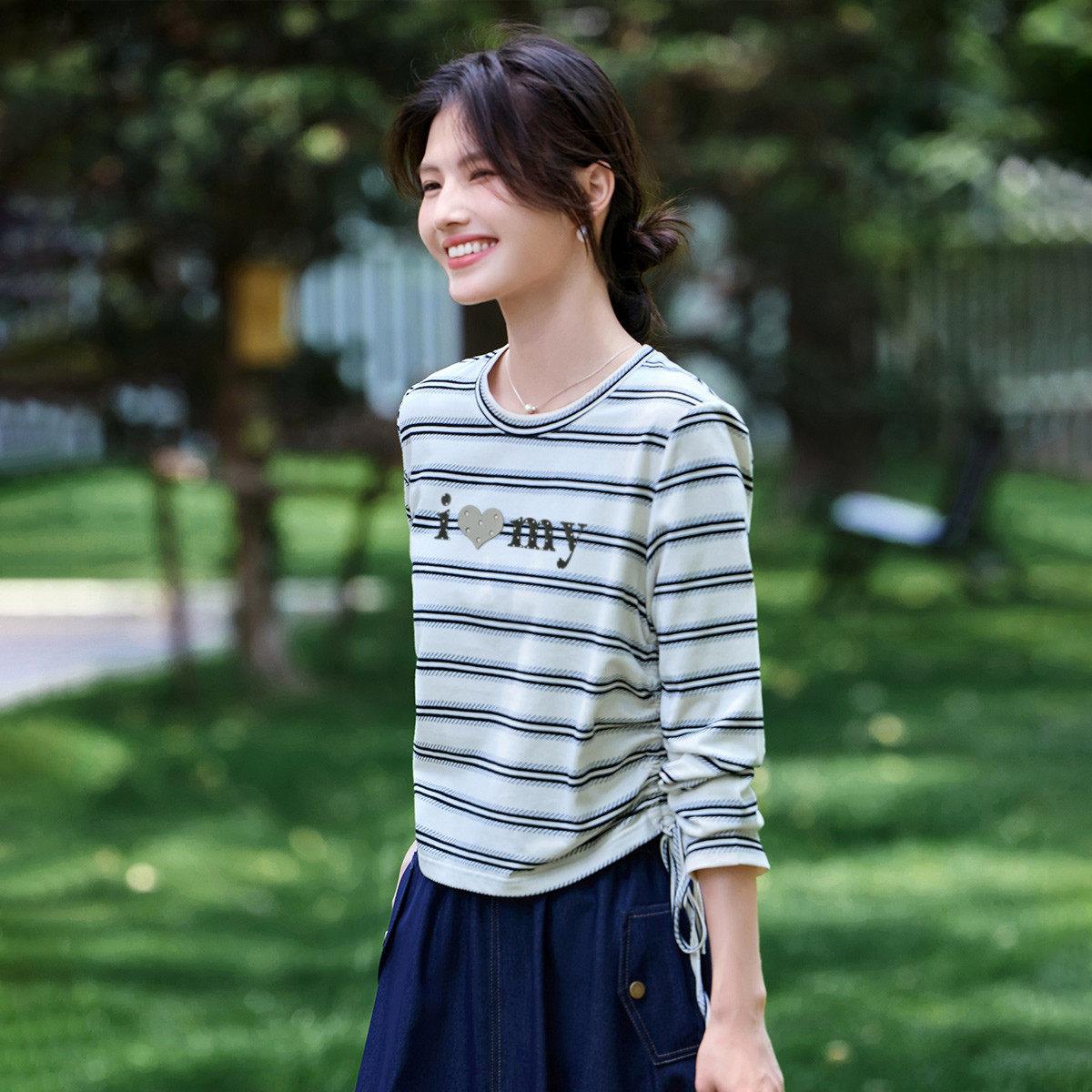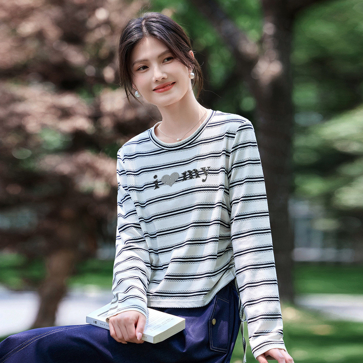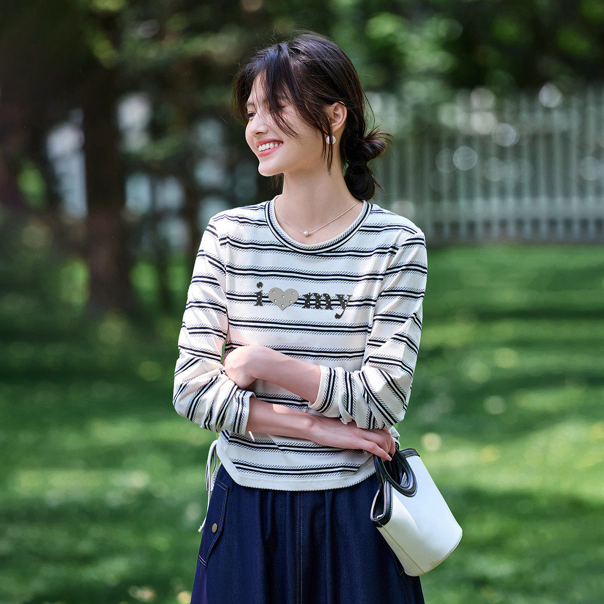 茵曼2026春季新款长袖t恤女正肩圆领独特超好看爆款内搭上衣条纹