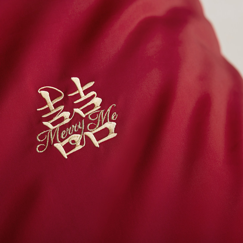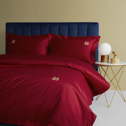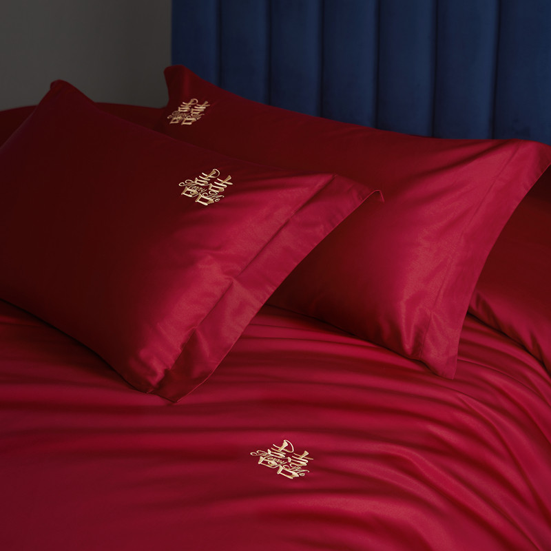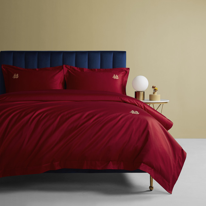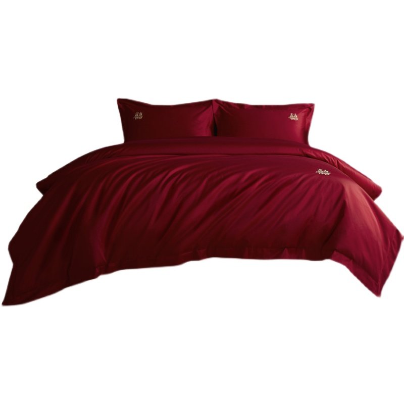新中式简约婚庆四件套双喜刺绣全棉100S长绒棉酒红色结婚被套床单
