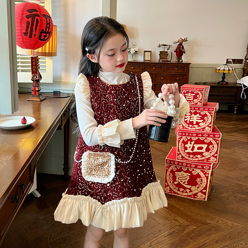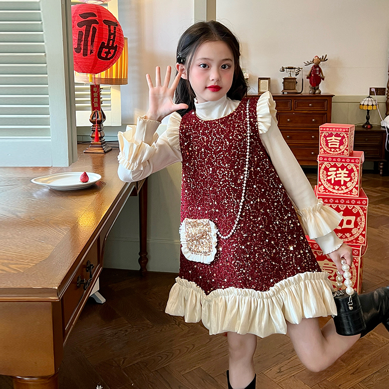 栀了成长记童装女童小香风亮片背心裙儿童宝宝新年裙子加绒连衣裙