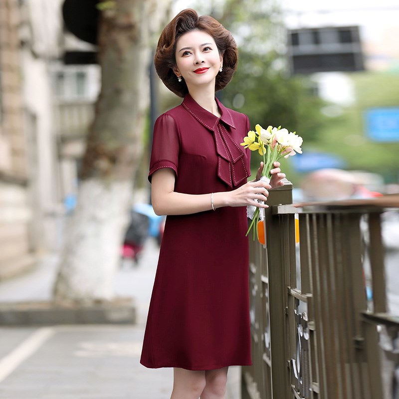 年轻妈妈夏装洋气连衣裙中年女装阔太太中老年小个子短袖雪纺裙子