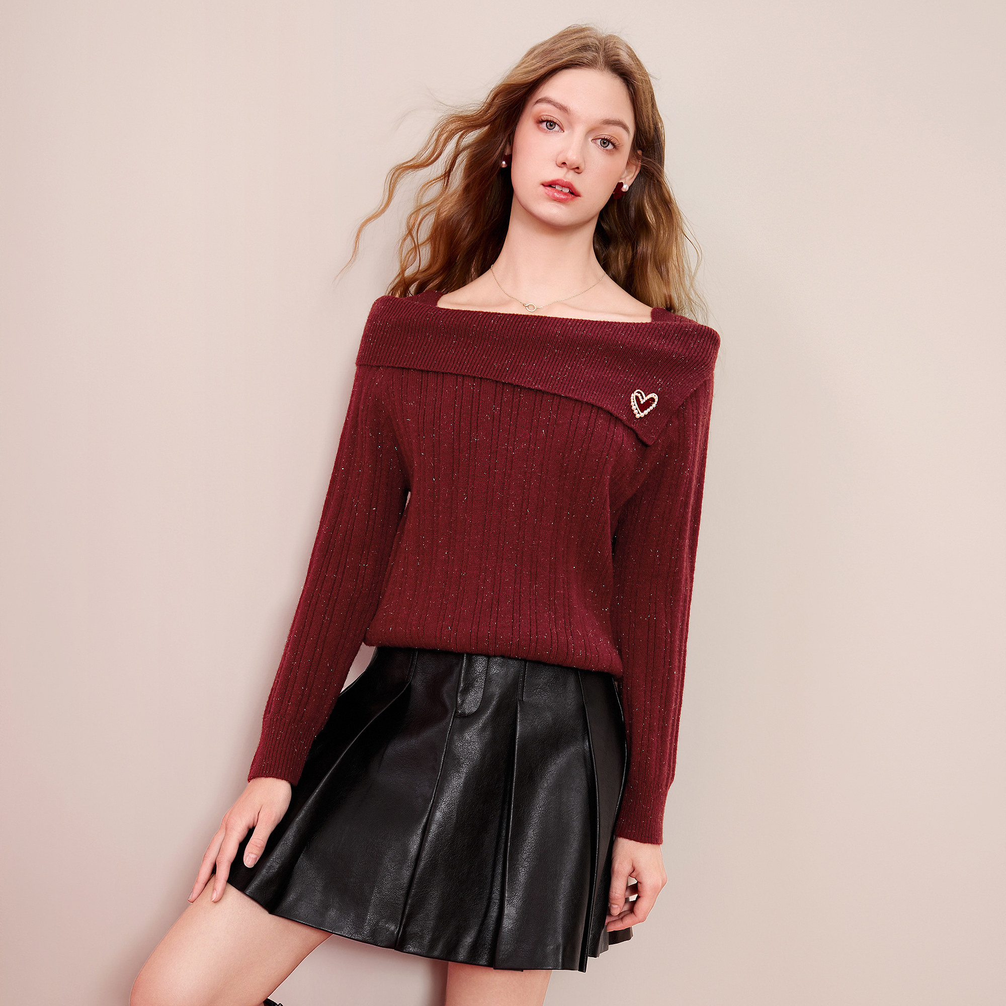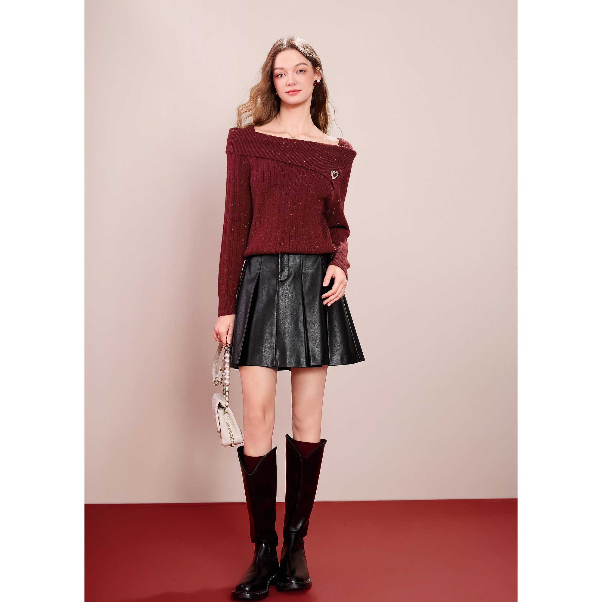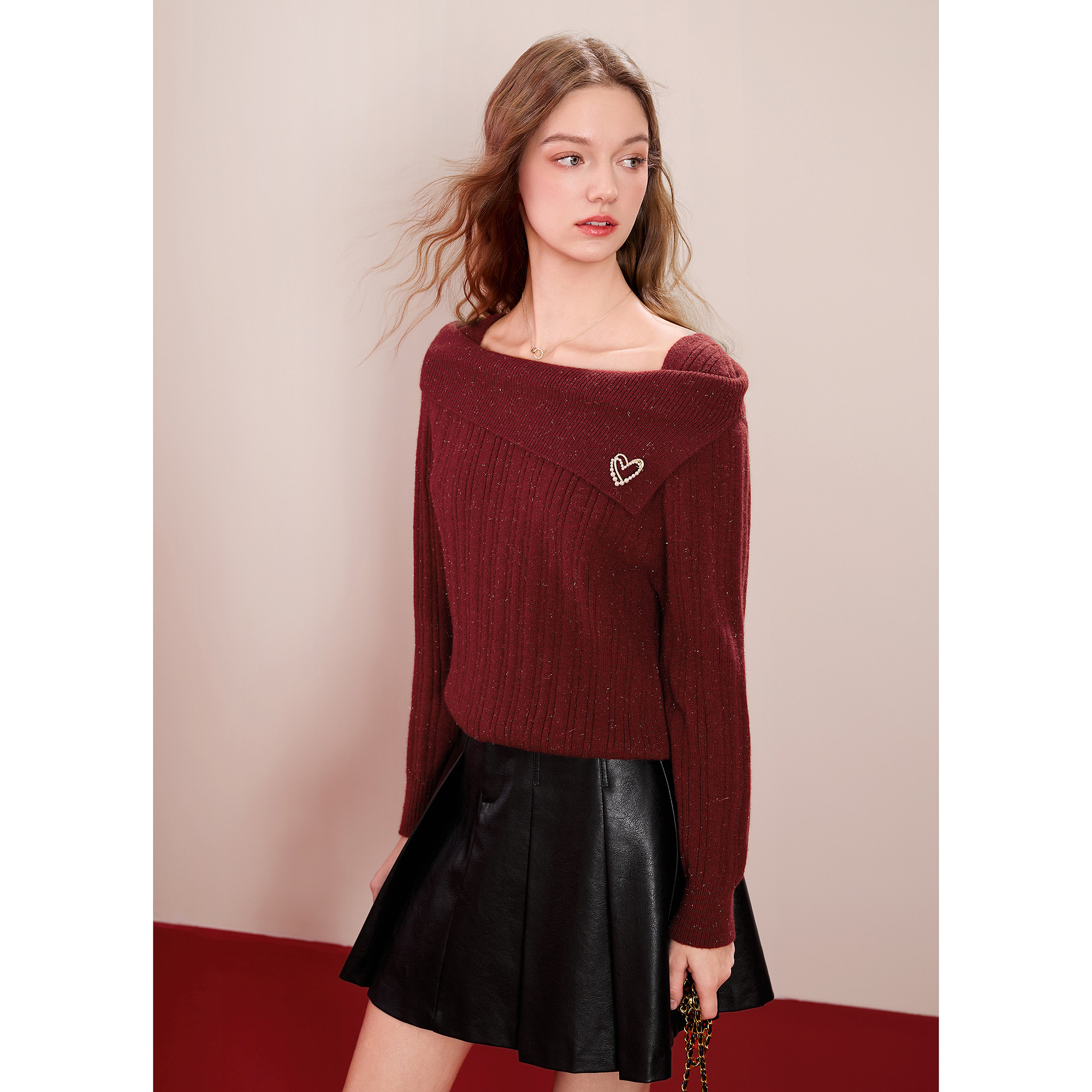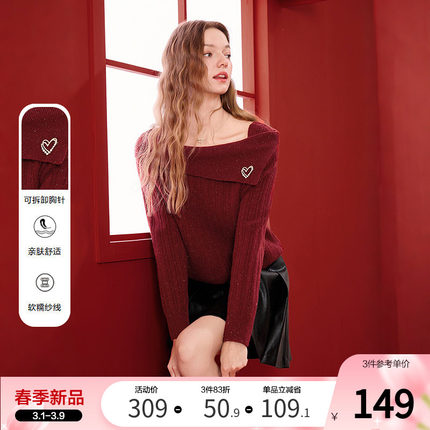betu百图新年氛围感红色针织衫2026年春季新款设计感一字肩上衣