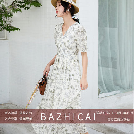 夏季轻奢感收腰雪纺碎花连衣裙女法式泡泡袖V领白色透气高腰长裙