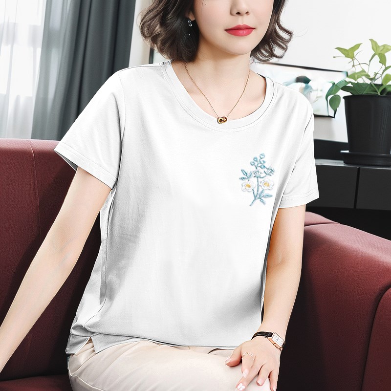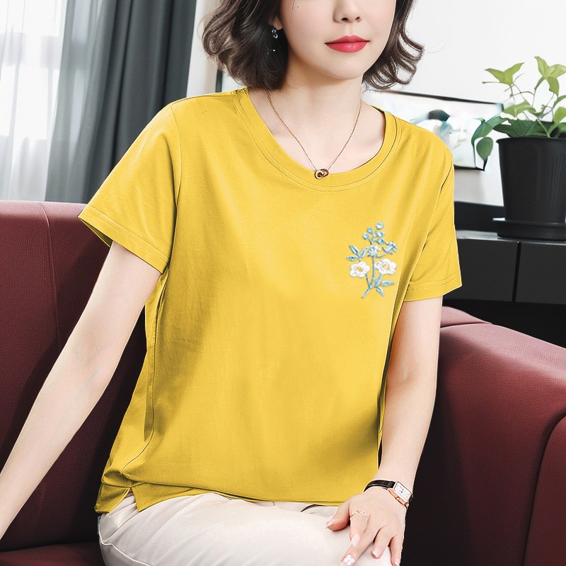纯棉短袖T恤女夏季妈妈圆领上衣宽松中老年女士休闲时尚全棉夏装