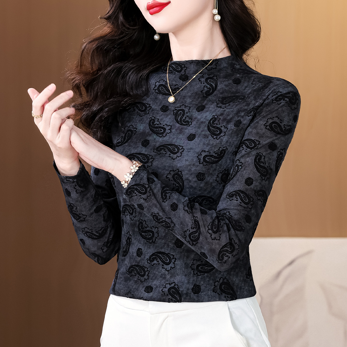 网纱印花半高领秋冬新款双层不透长袖上衣女士蕾丝大码显瘦打底衫
