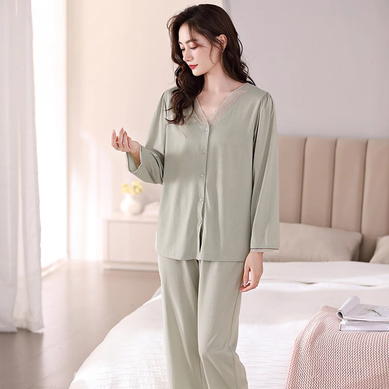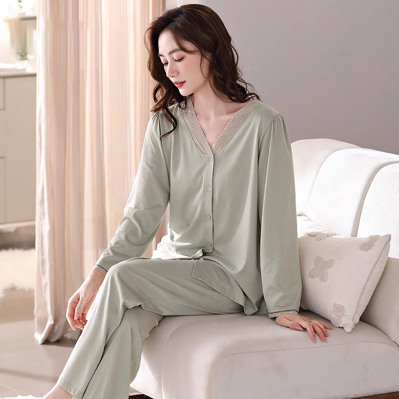 春秋款睡衣女长袖纯棉2025新款高级感中年春款宽松绿色开衫家居服