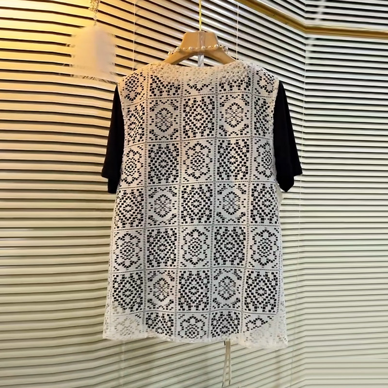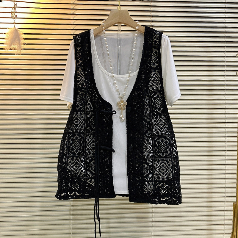 加大码女装V领盘扣蕾丝马甲短袖T恤胖妹妹休闲减龄百搭显瘦两件套