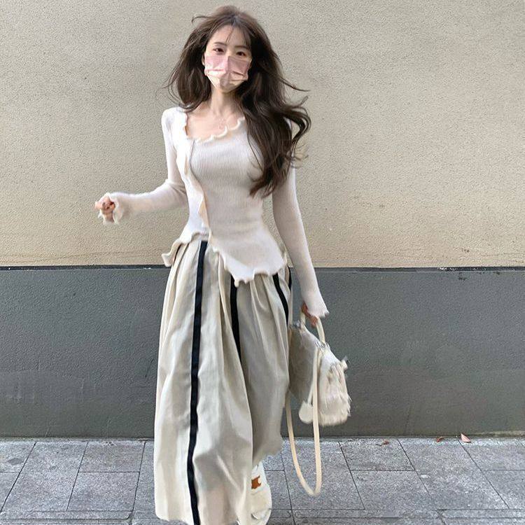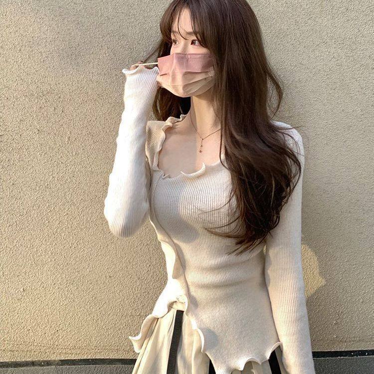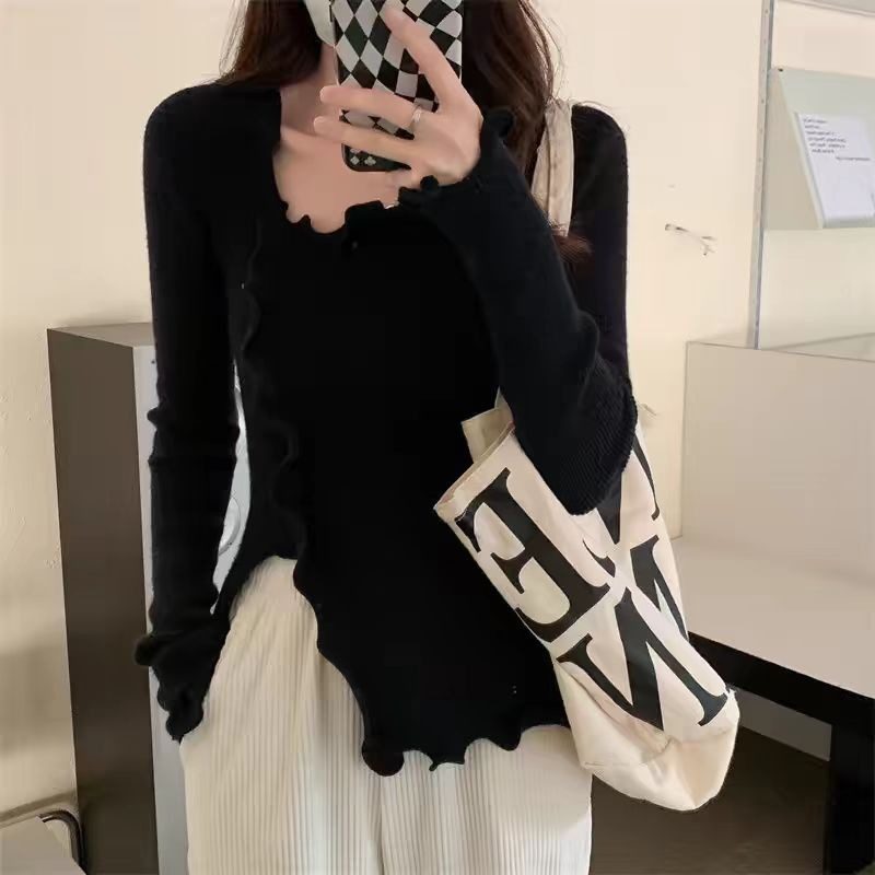 大码女装300斤木耳边不规则秋冬法式内搭打底开叉修身遮肚上衣女