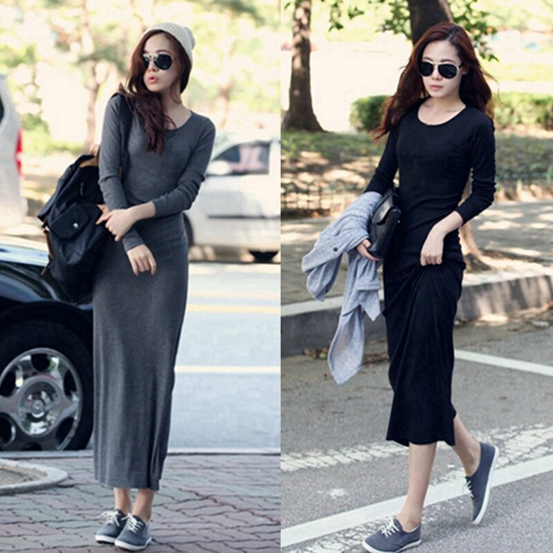 秋冬黑色过膝宽松打底裙女超长袖内搭中长款连衣裙直筒裙长裙大码
