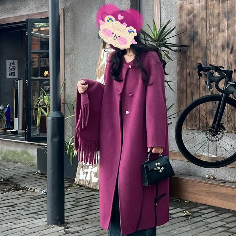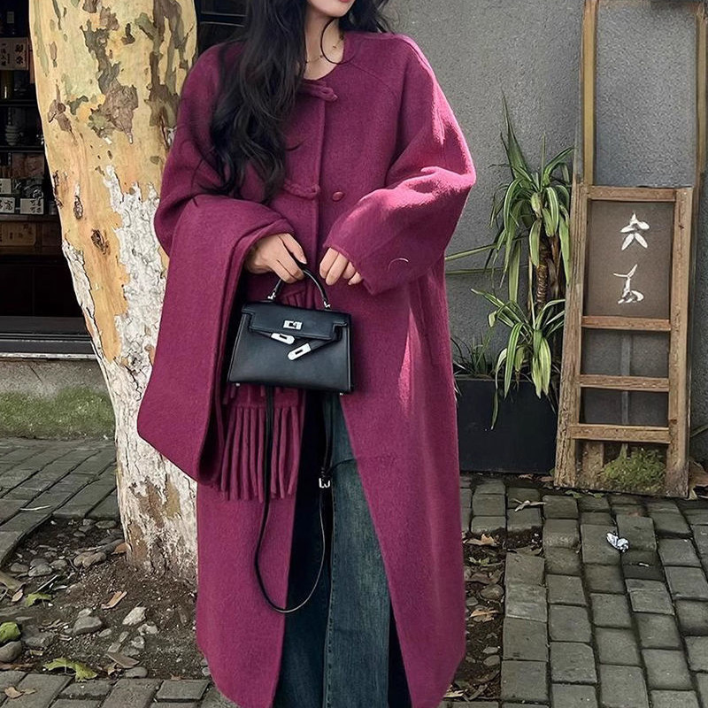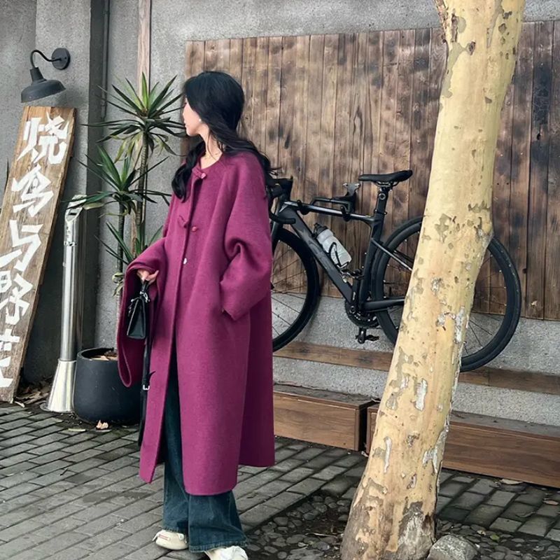 秋冬新款气质宽松柔软亲肤国风大衣女中长款紫色毛呢外套温柔高端
