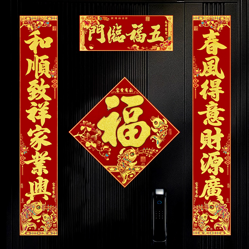 2026马年对联过年植绒彩金春联福字新年自带背胶门联年画福字斗方