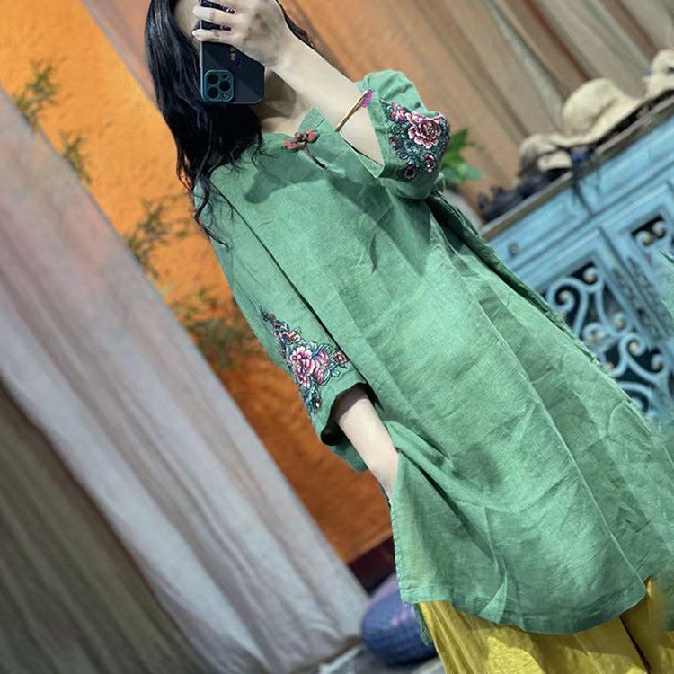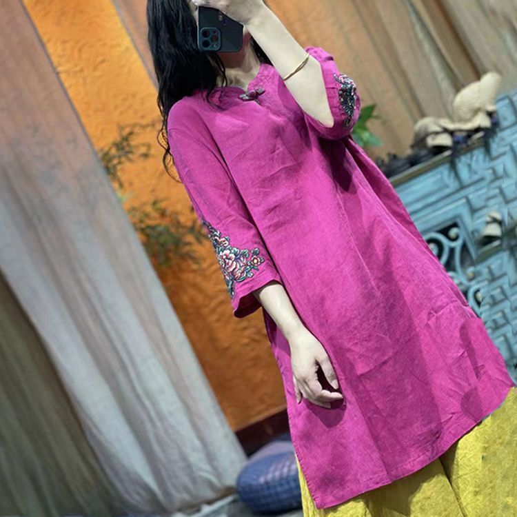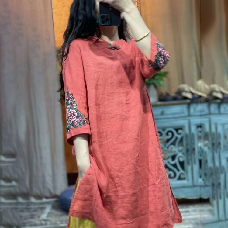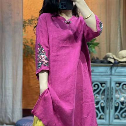 中式棉麻复古国风连衣裙重工刺绣民族夏季旗袍裙子中长款五分袖