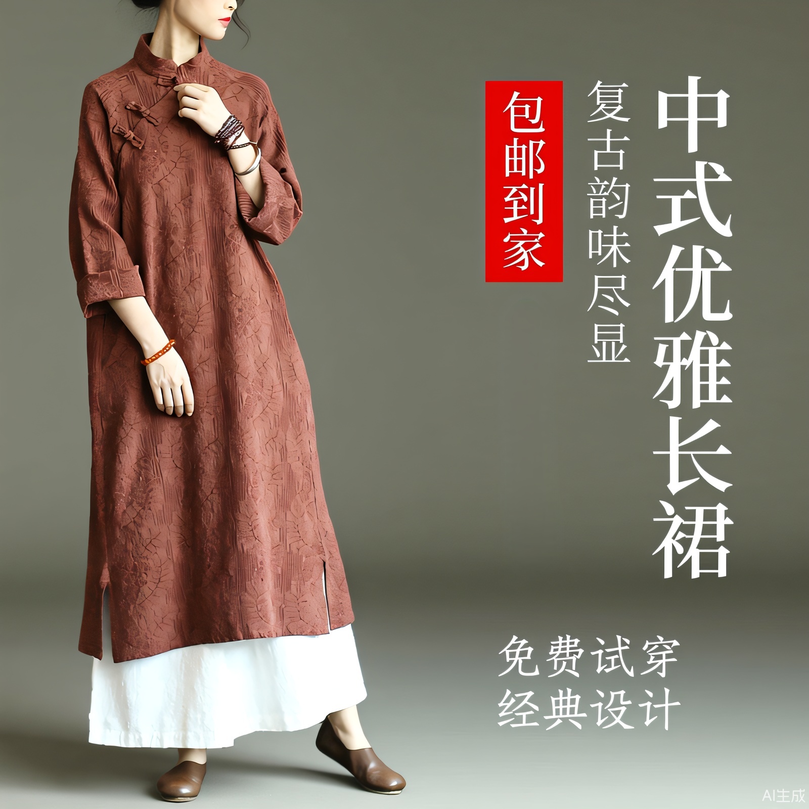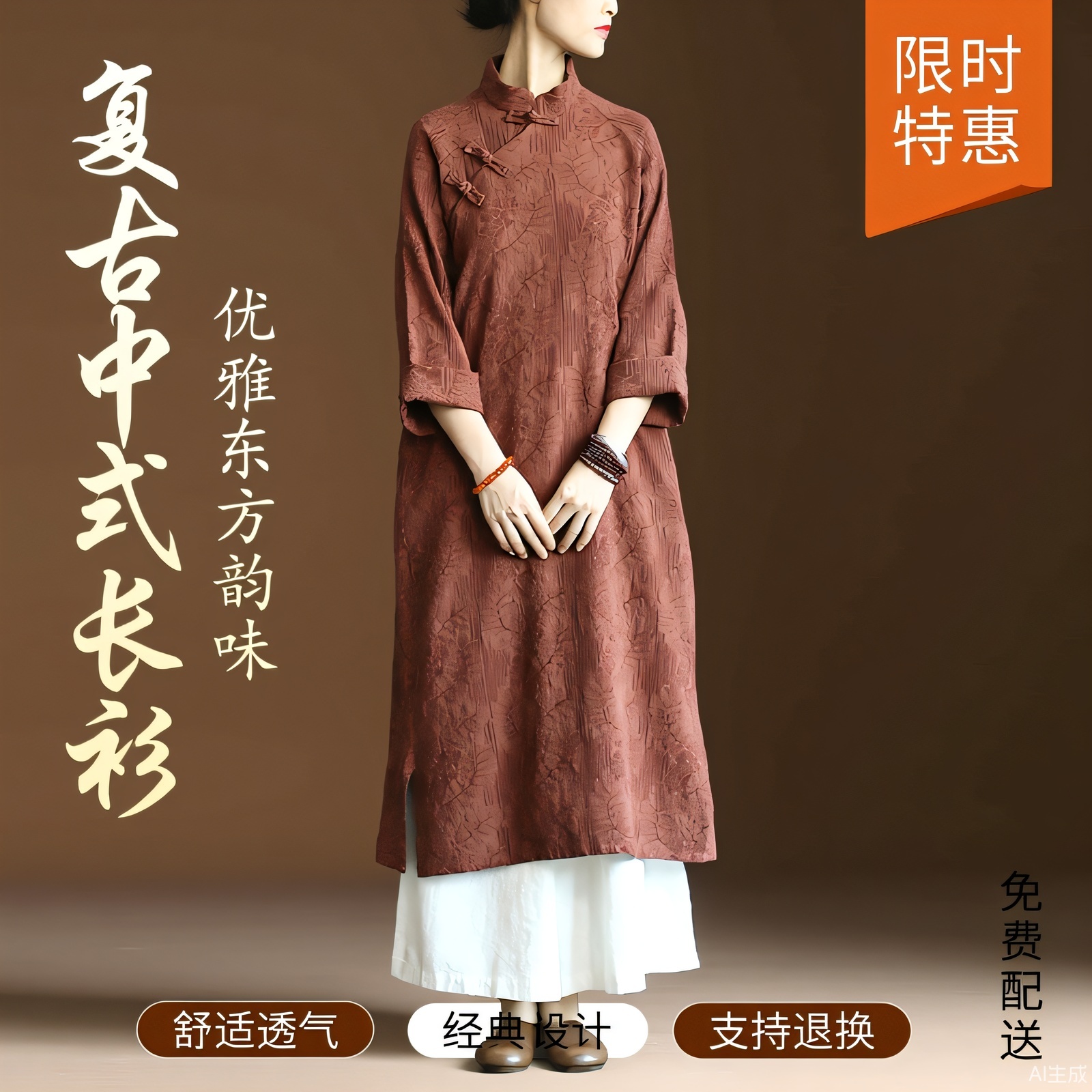 佛系禅意袍子|棉麻宽松旗袍 经典咖色长袍中式国风茶服女装七分袖