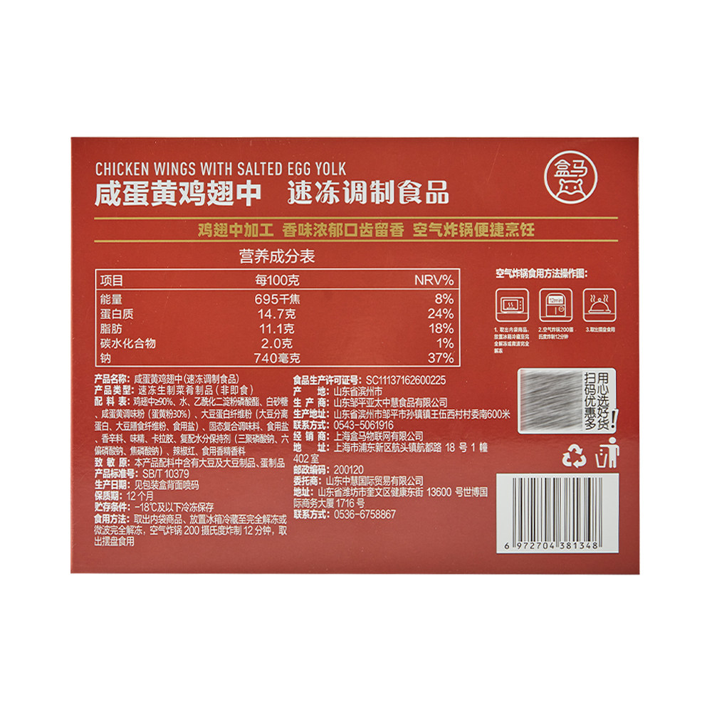 盒马 咸蛋黄鸡翅中 260g*3盒