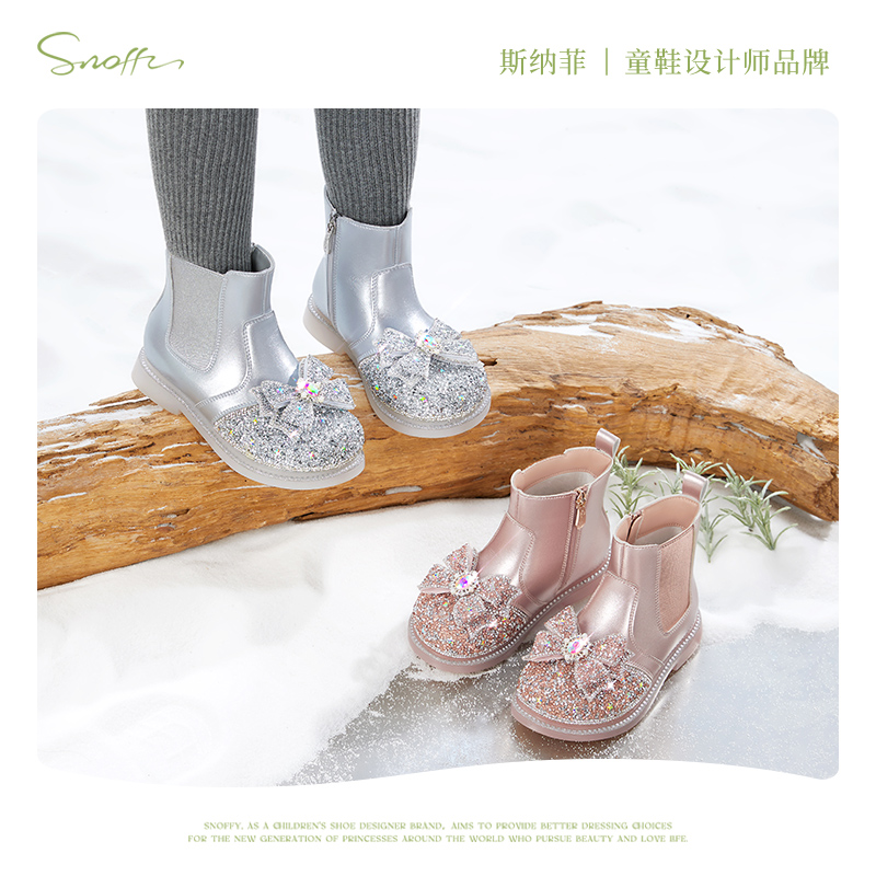 斯纳菲儿童短靴女童靴子小公主水晶靴2025秋冬新款短靴加绒皮靴
