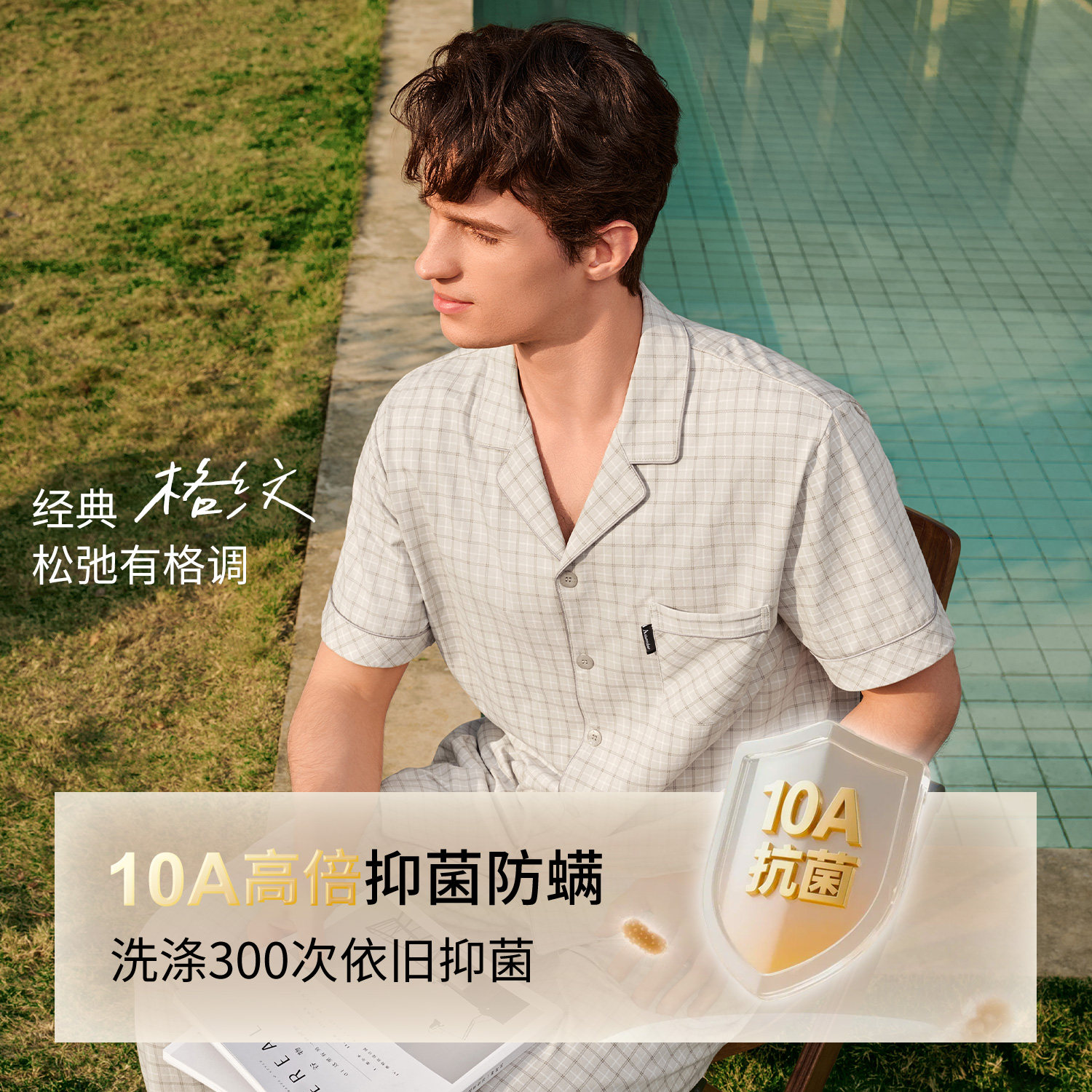 秋鹿睡衣男士10A抗菌翻领格纹薄款短袖长裤2026春夏季新款家居服