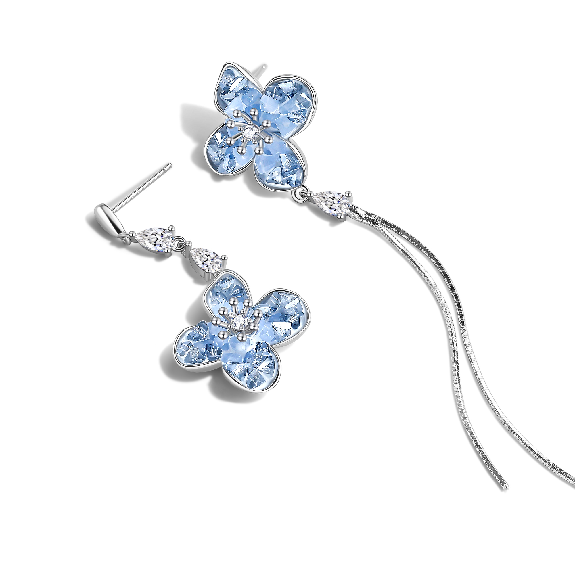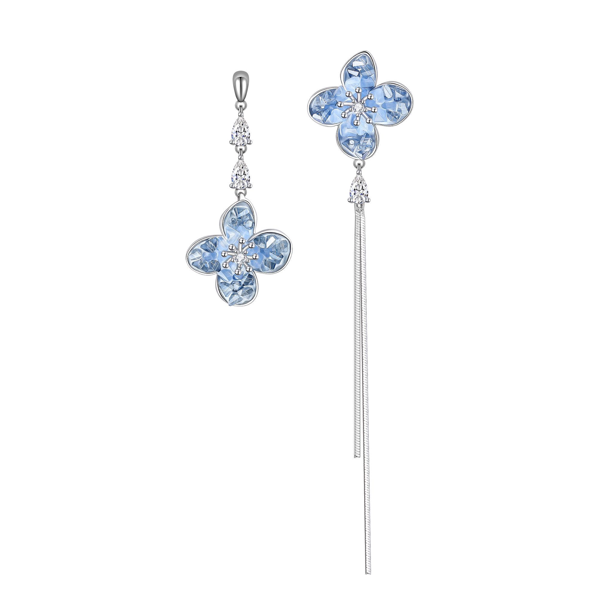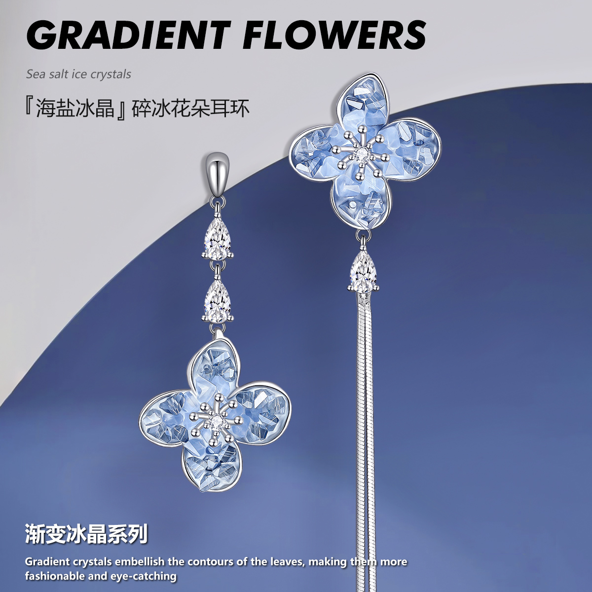 海盐冰晶碎冰花耳环女渐变水晶流苏耳钉蓝色耳坠四叶草不对称耳饰