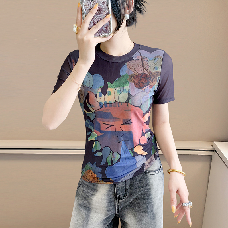 时尚印花短袖欧货弹力网纱上衣女