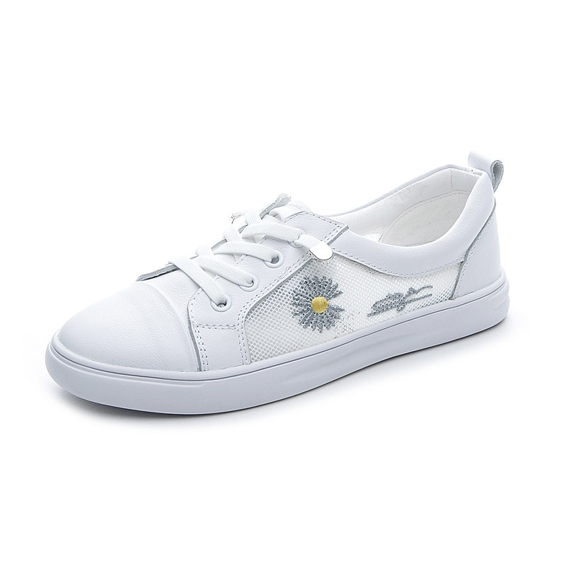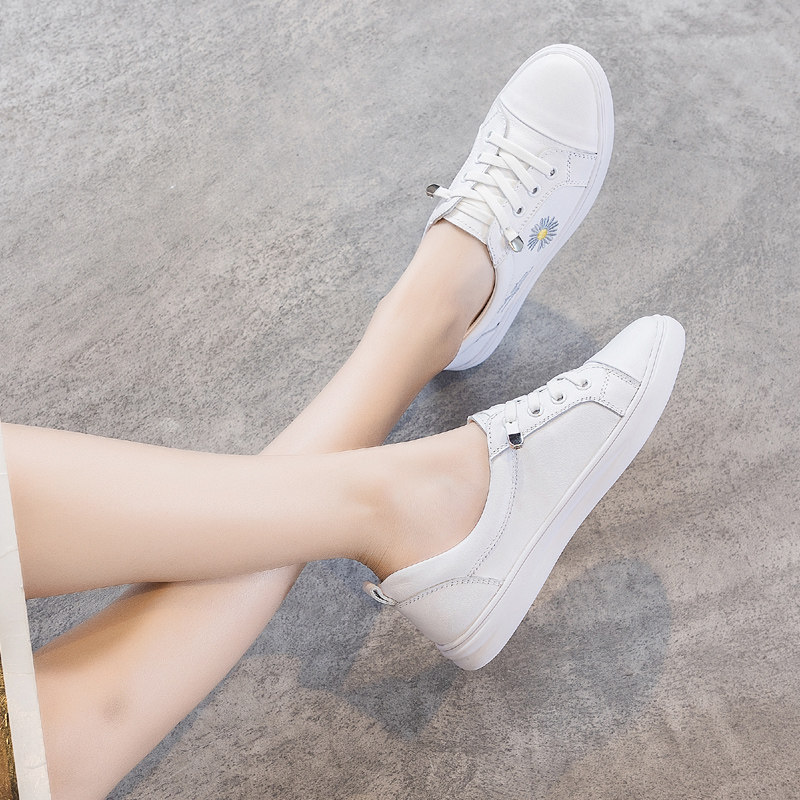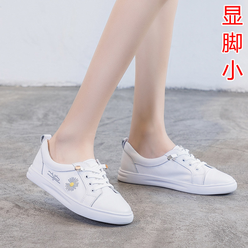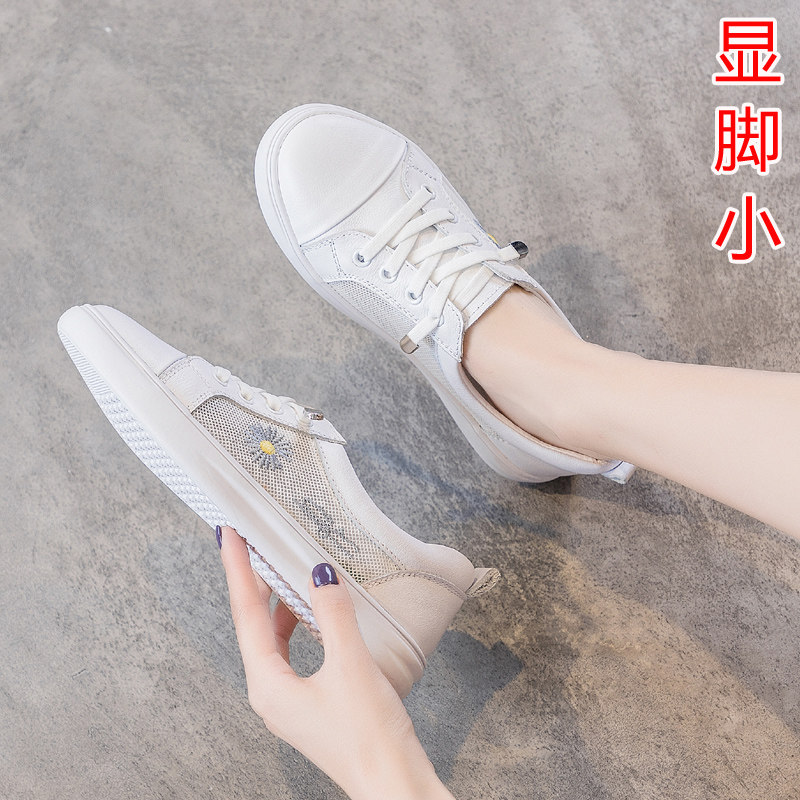春季小皱菊小白鞋真皮浅口平底网纱一脚蹬大码网红女鞋41一43单鞋