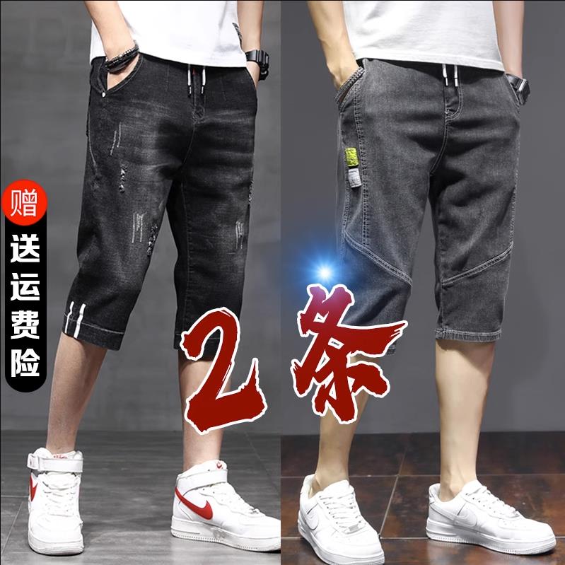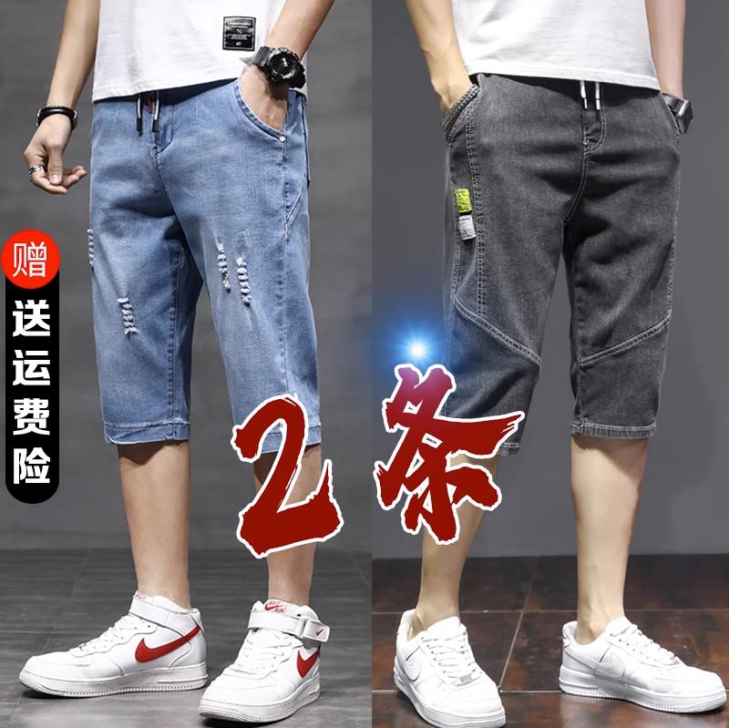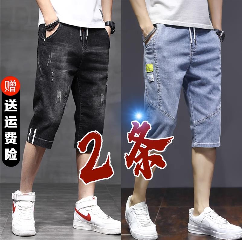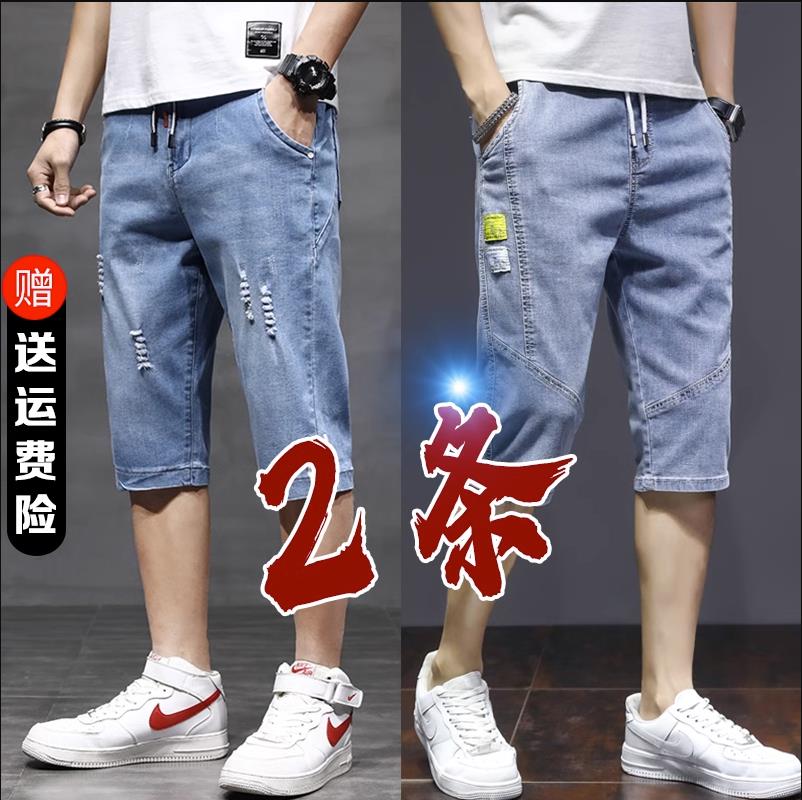 夏季薄五分牛仔短裤男七分裤韩版潮流宽松破洞直筒抽绳松紧腰中裤