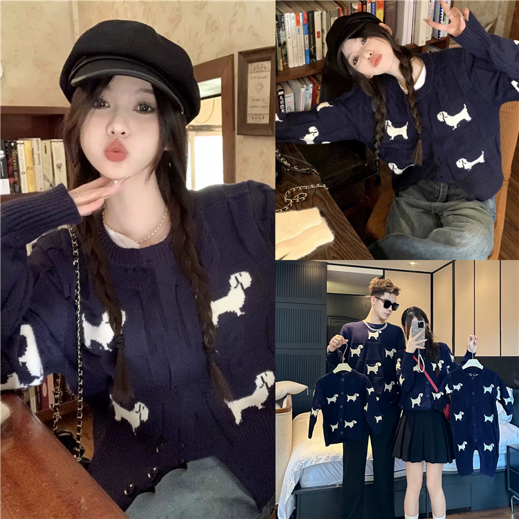 婴儿亲子装一家三口母女秋冬洋气狗狗提花麻花针织衫毛衣全家装潮