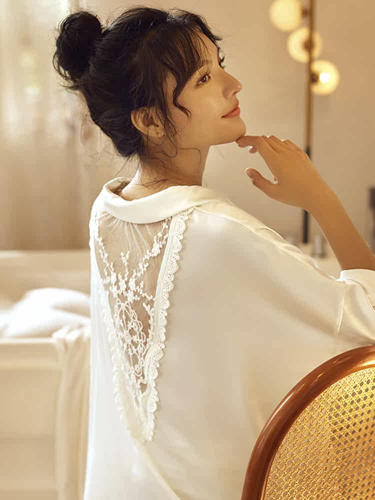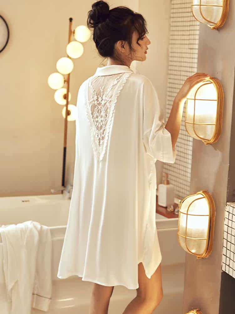 睡裙女夏季长款薄款冰丝性感男友风白色衬衫后背蕾丝春秋透气睡衣