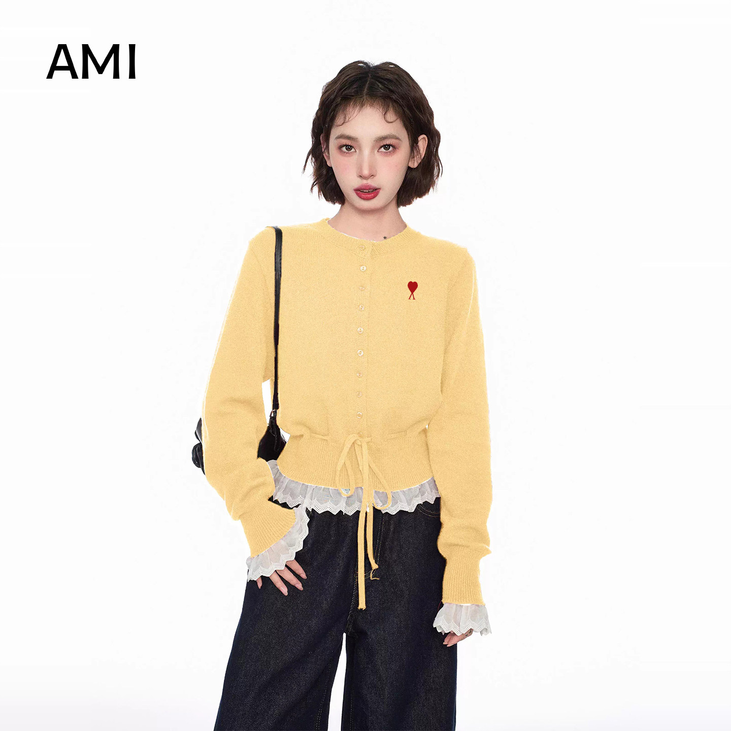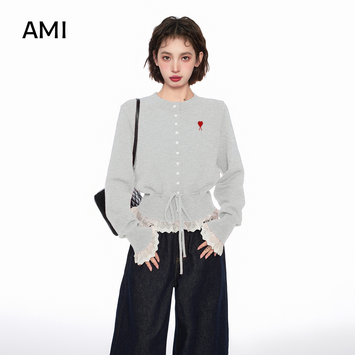 AMI 2025灰色假两件蕾丝针织毛衣女秋小个子短款开衫外套上衣薄