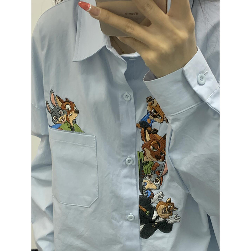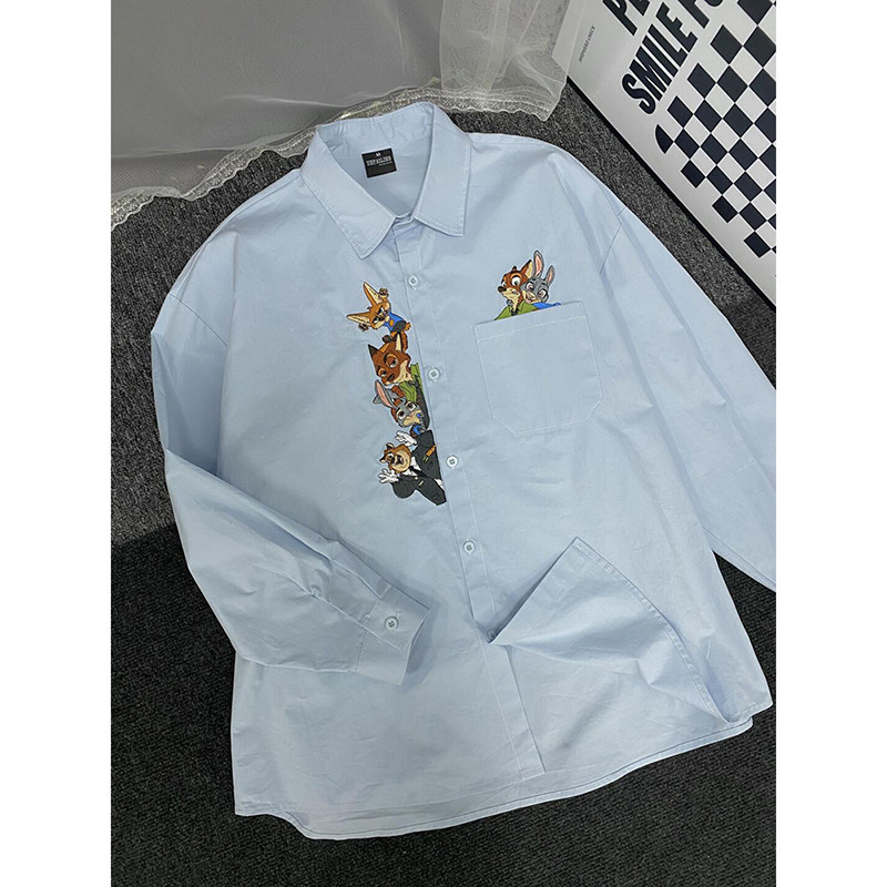 特大码300斤蓝色卡通刺绣衬衫男女装夏季潮牌设计感高级情侣外套2
