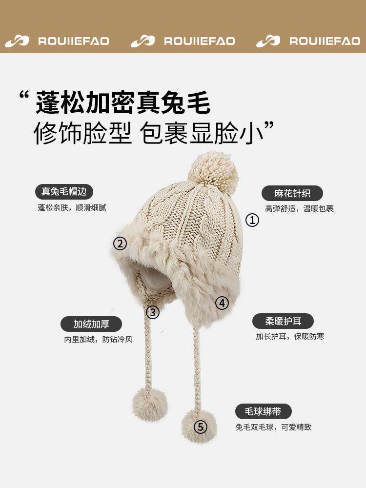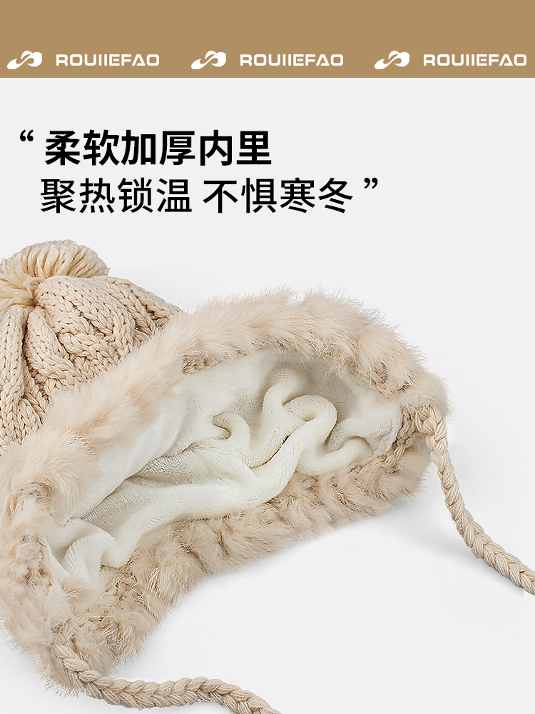 ROUIIEFAO兔毛针织帽子女冬季加绒加厚防寒雷锋帽保暖护耳毛线帽