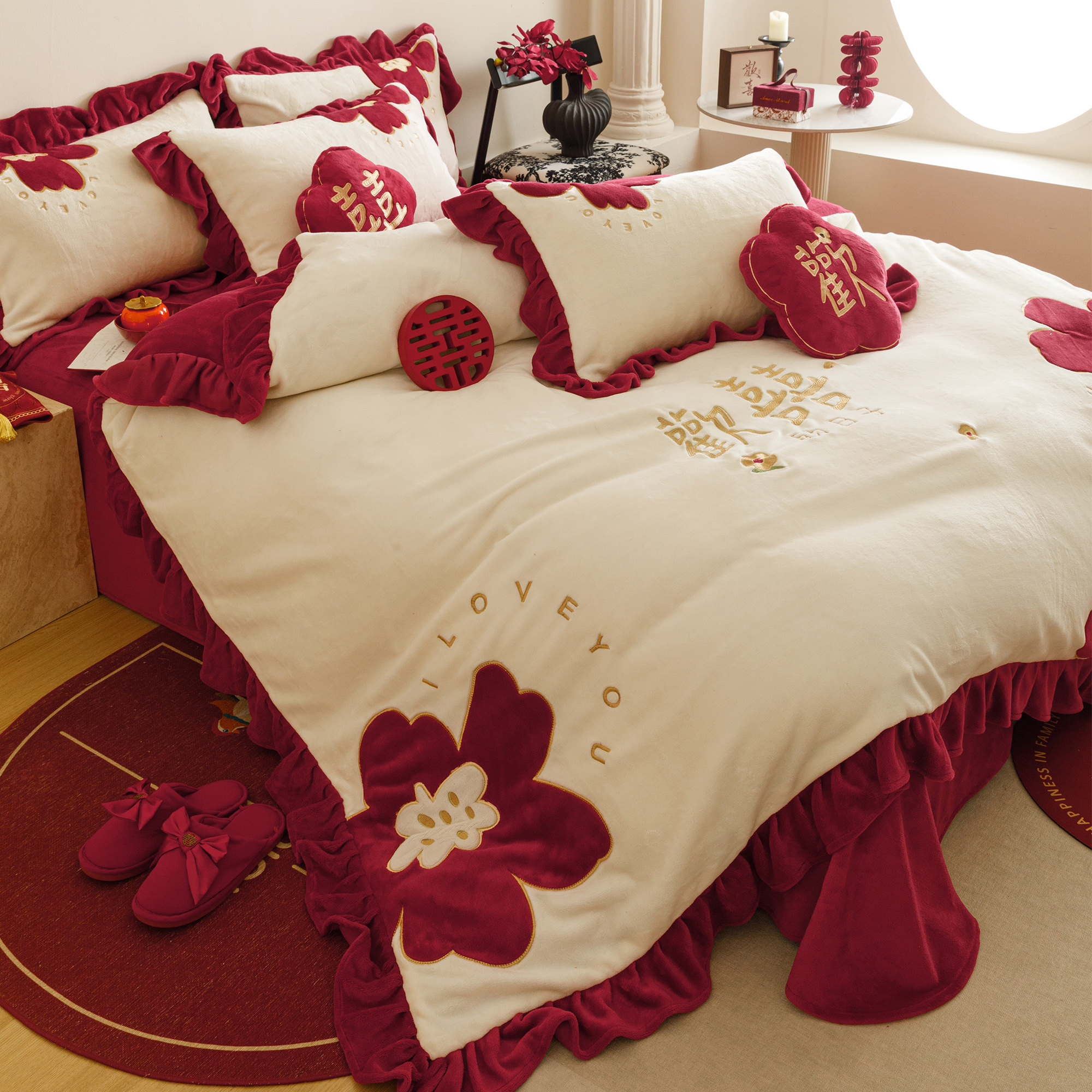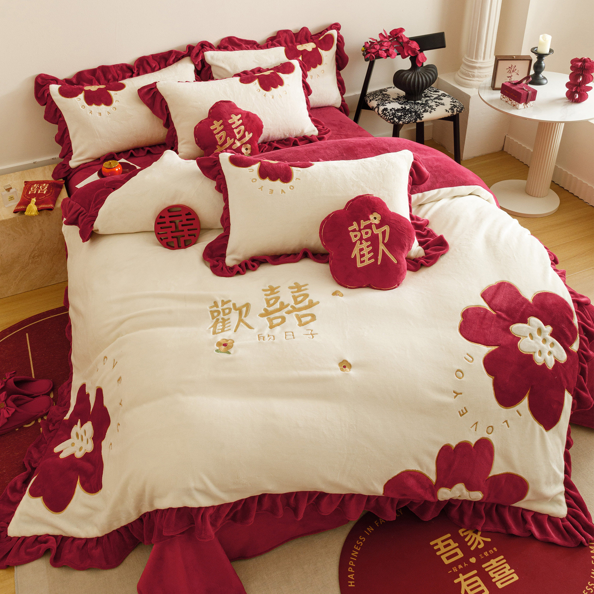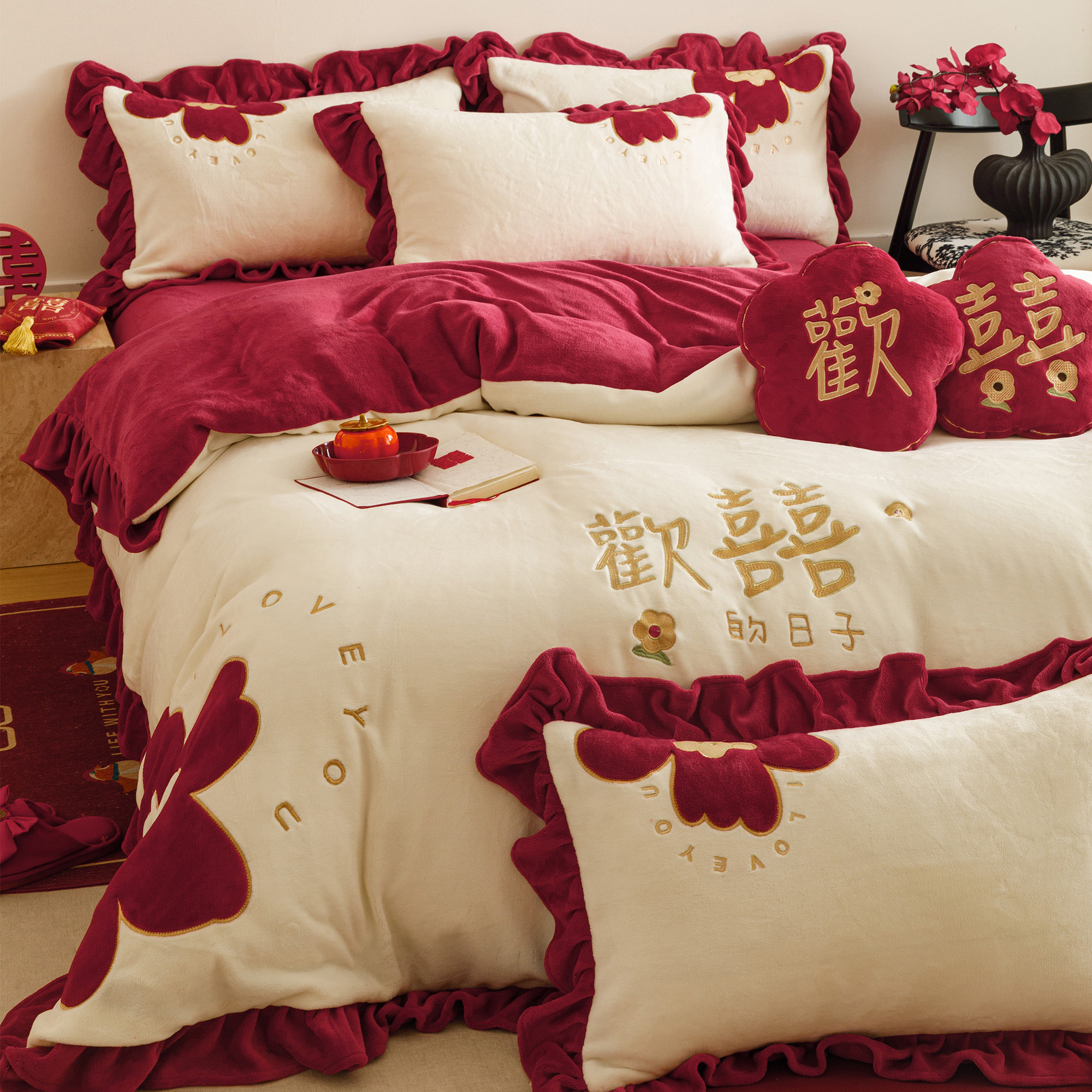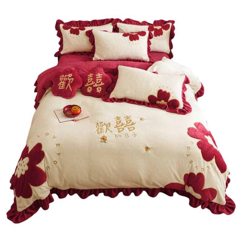 欢喜刺绣秋冬牛奶绒婚庆四件套保暖贴布绣法兰绒结婚被套床单床笠