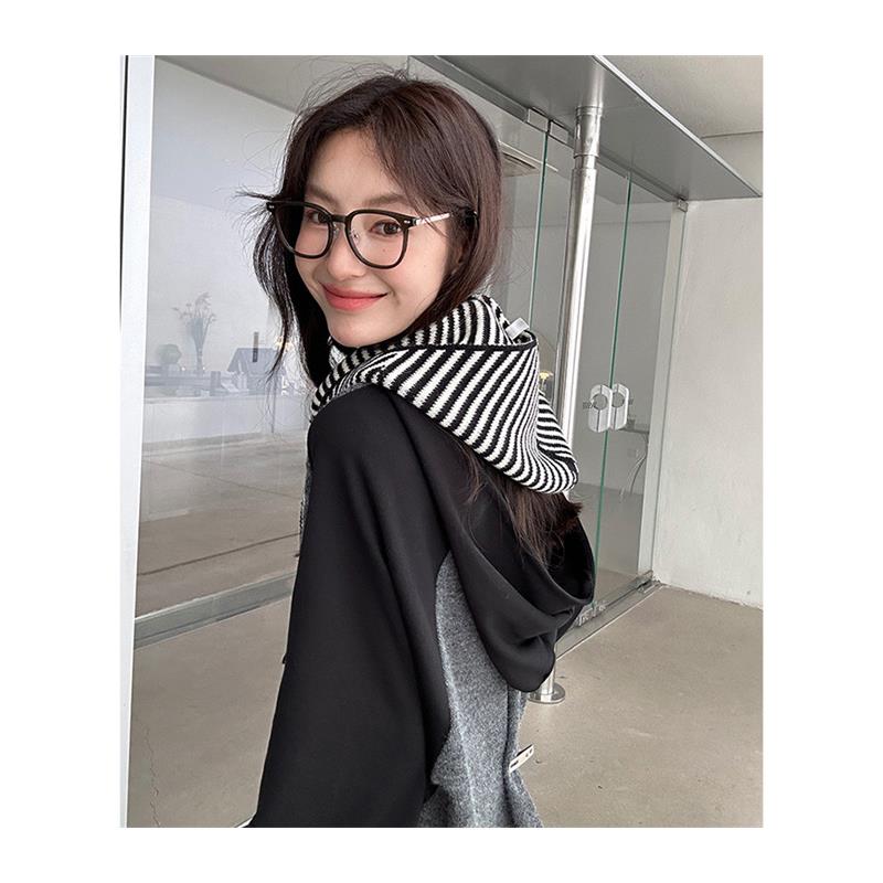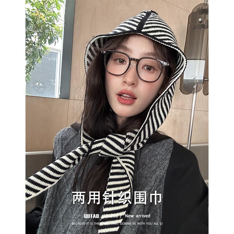 韩版条纹帽子围巾一体女秋冬季百搭复古保暖披肩围脖毛线针织连帽