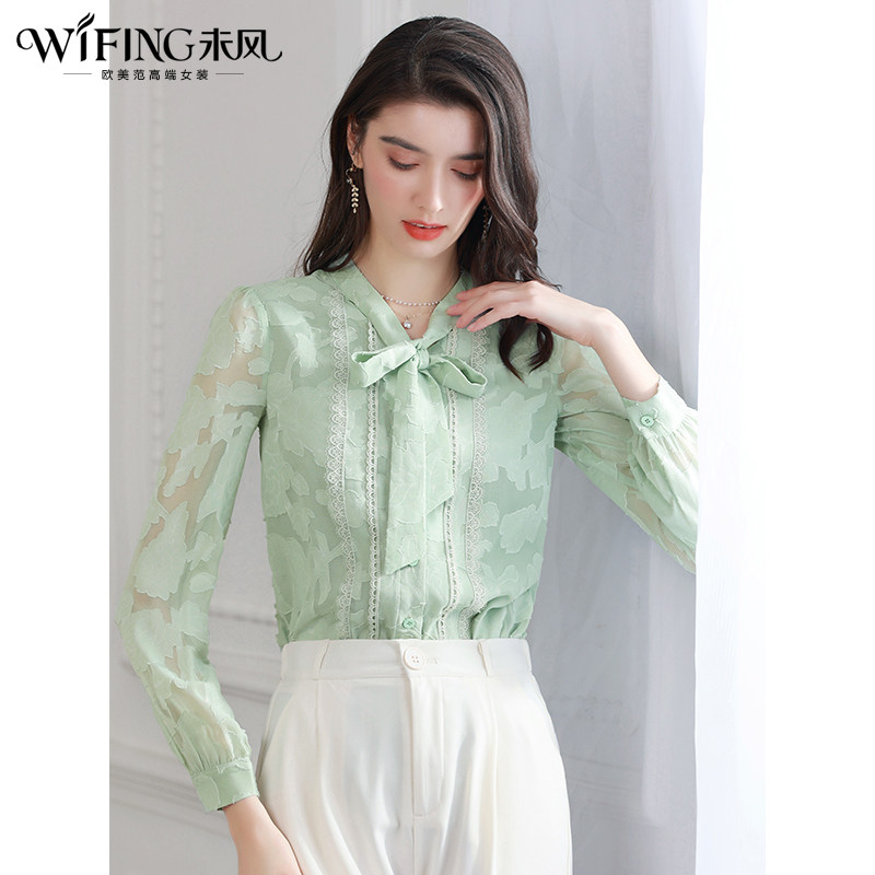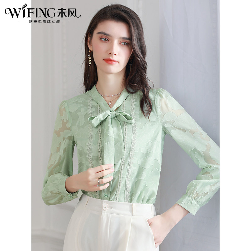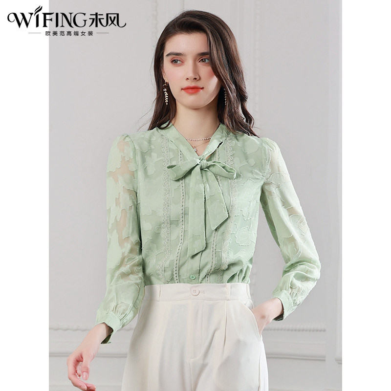 未风绿色雪纺衫女秋2025秋季新款女装飘带长袖上衣设计感洋气衬衫