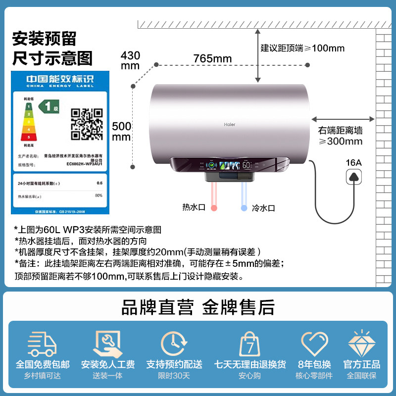 海尔一级能效电热水器家用卫生间除氯净水变频速热洗澡60L80升WP3