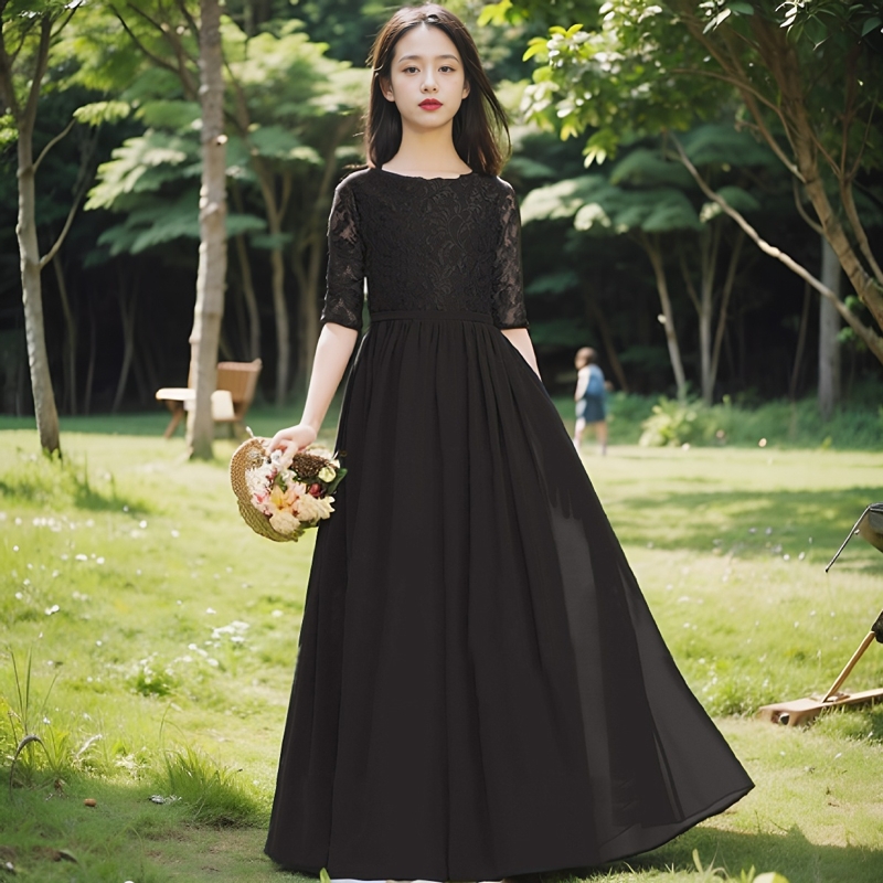 高端齐地女儿童钢琴长款黑色舞台礼服古筝大小提琴演奏表演服蕾丝