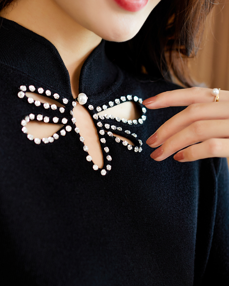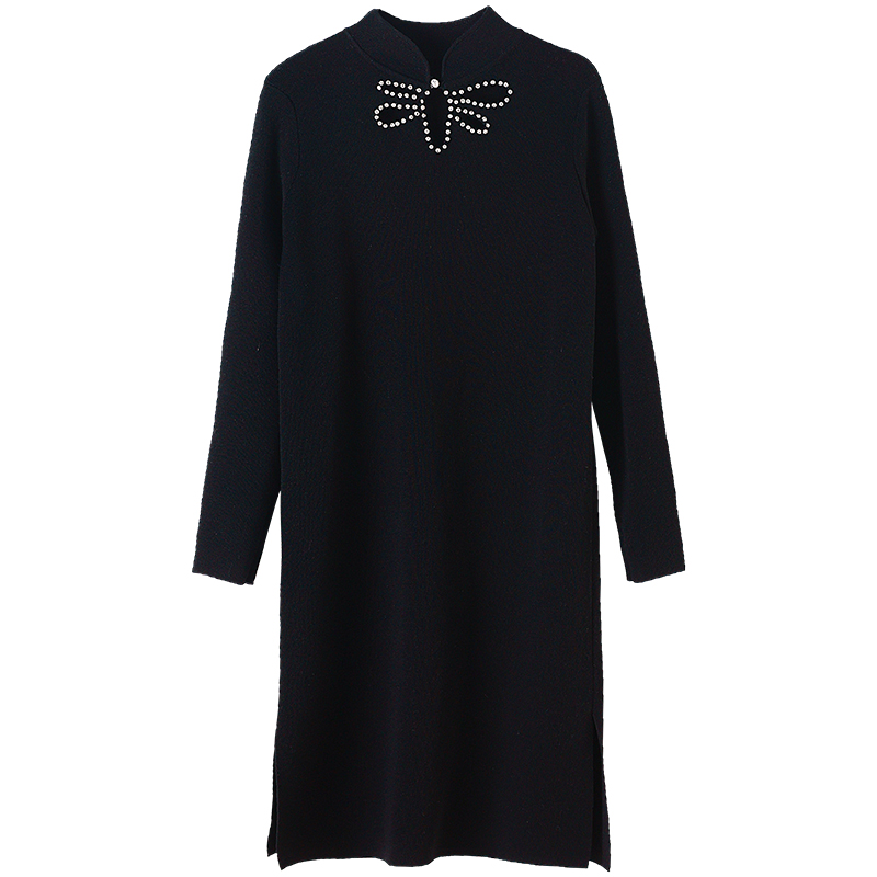 玉米高端 优雅国风气质镂空羊毛针织旗袍裙女黑色显瘦连衣裙P