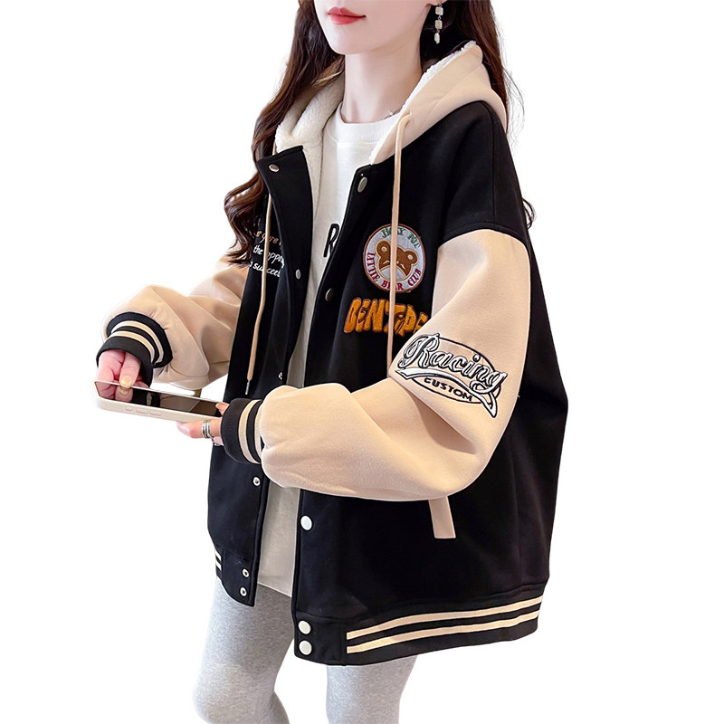 加绒加厚棒球服外套女秋冬2025新款初高中学生甜美刺绣羊羔毛棉衣