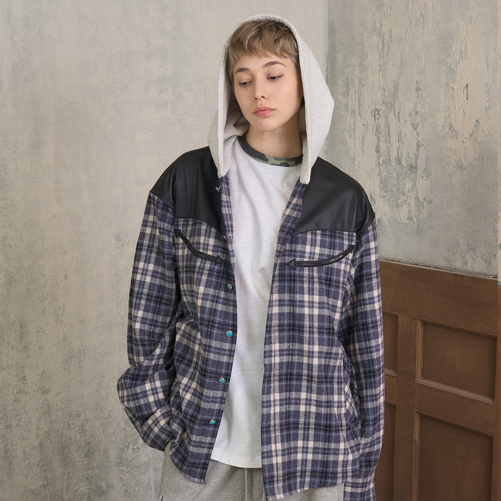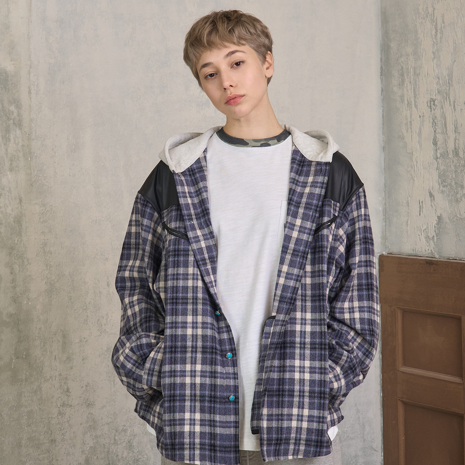 s45仿松石拼皮格纹长袖带帽衬衫夹克宽松外套男女