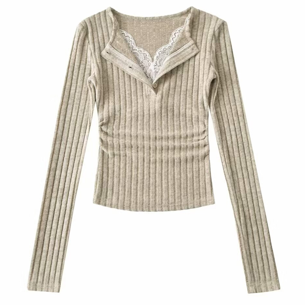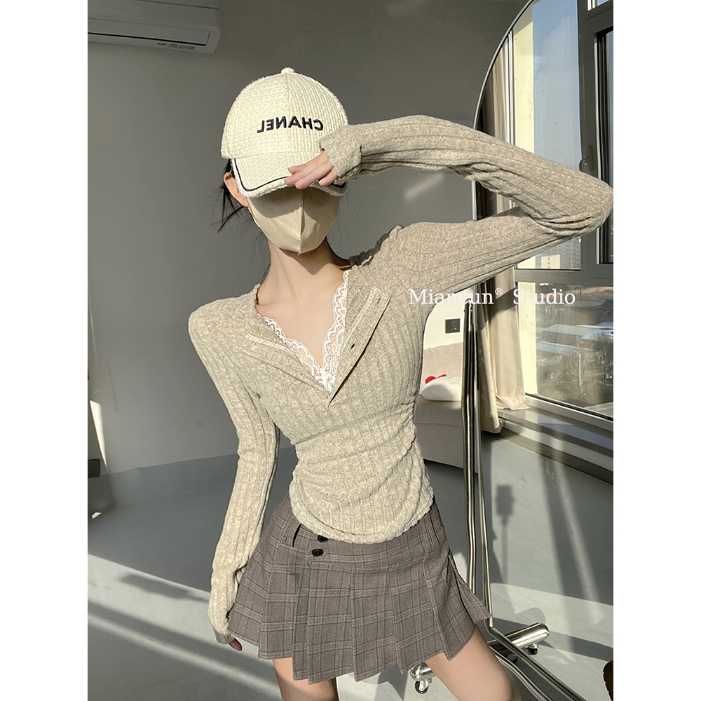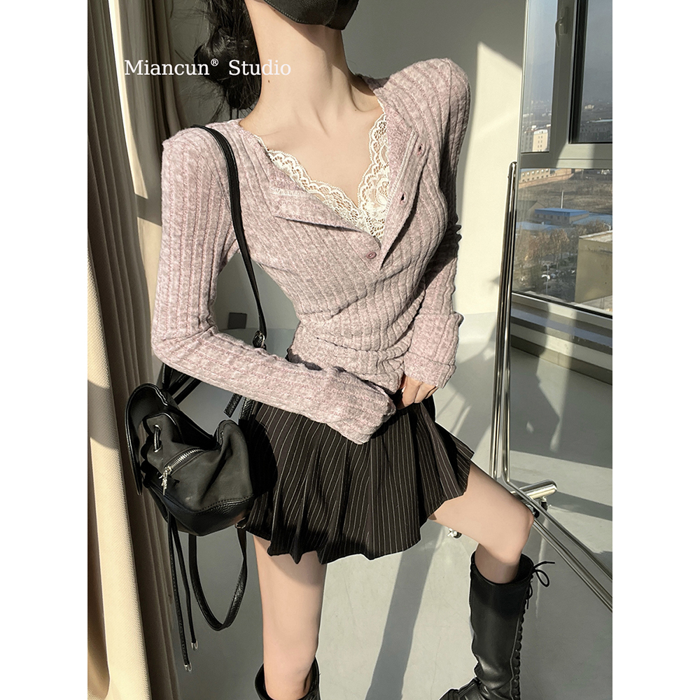 MianCun纯欲蕾丝拼接假两件V领坑条针织衫气质修身T恤内搭上衣女