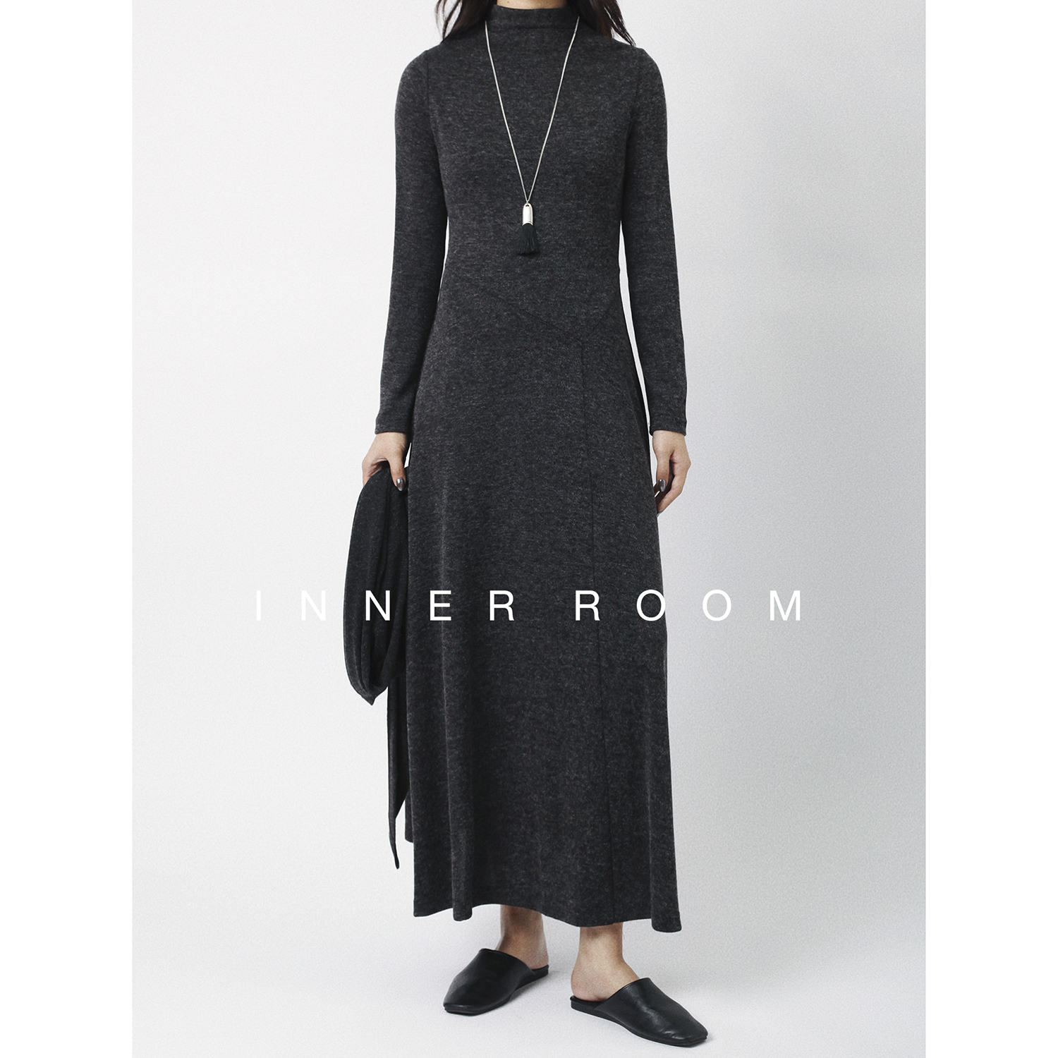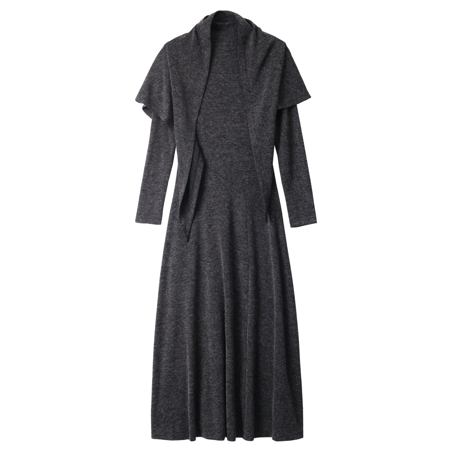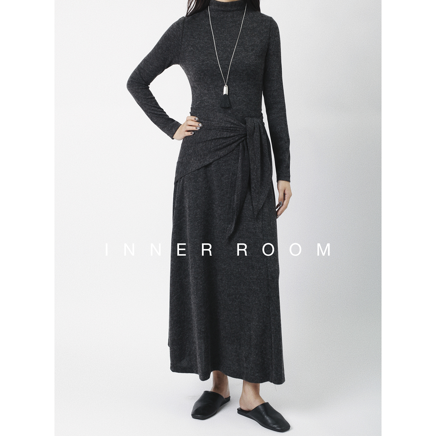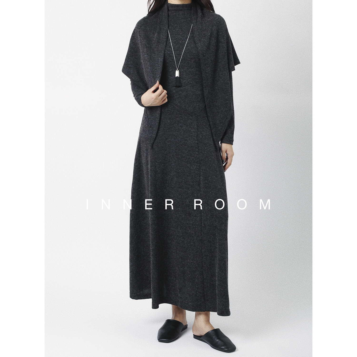 INNER ROOM法式复古披肩灰色针织裙秋冬长袖纽结修身内搭连衣裙