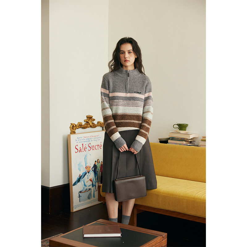 HeyDress半高领条纹毛衣女冬季复古慵懒加厚宽松灰色渐变针织上衣