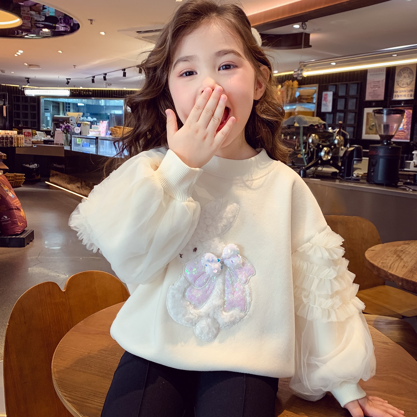 女童加绒卫衣冬装2025新款儿童韩版花边网纱袖公立体卡通套头上衣