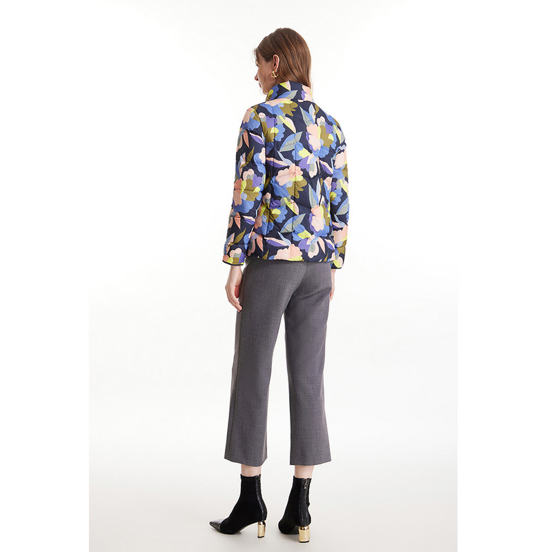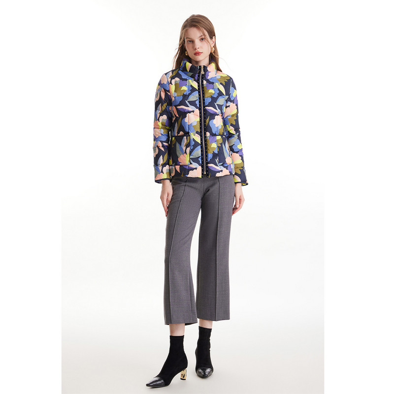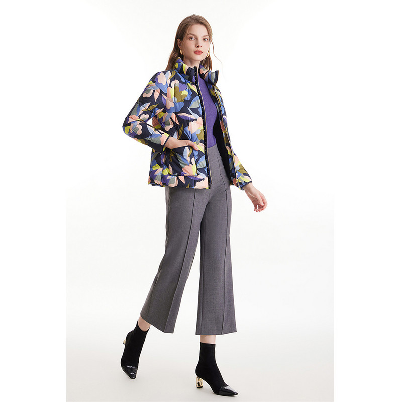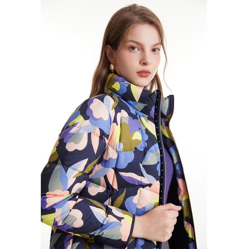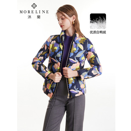MORELINE沐兰冬小立领几何撞色印花保暖白鸭绒女羽绒服
