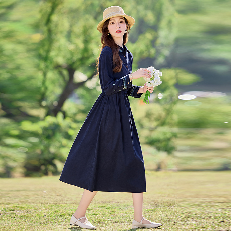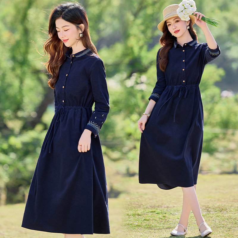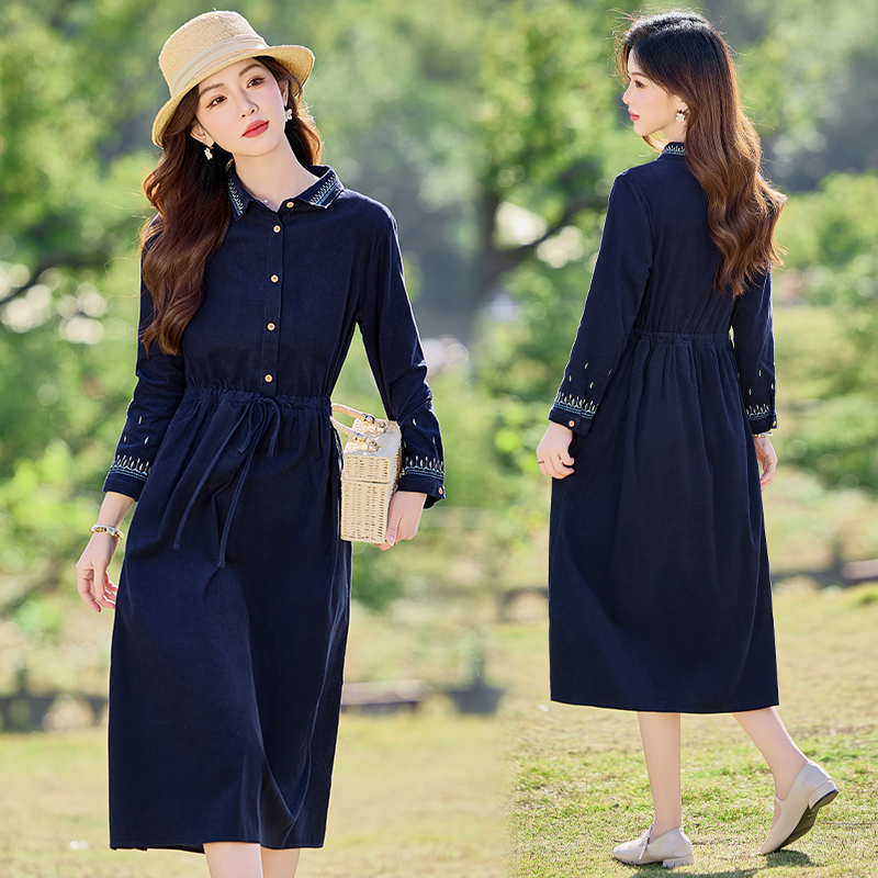 复古刺绣长袖连衣裙女中长款2025春秋新款休闲气质灯芯绒衬衫裙子